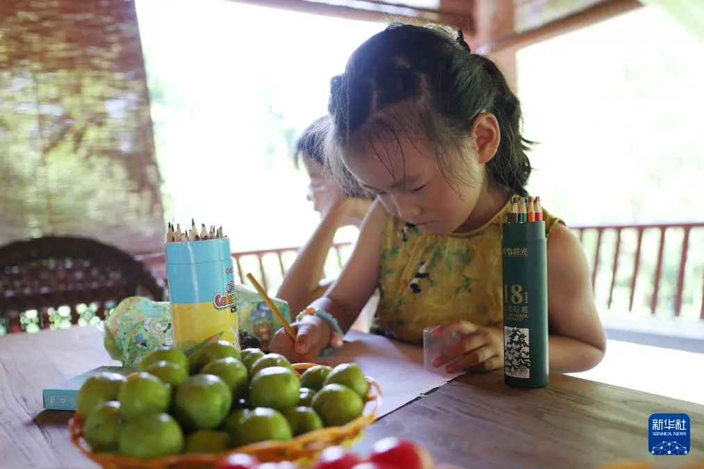 7月13日,小朋友在成县杜甫草堂景区茶社绘画。