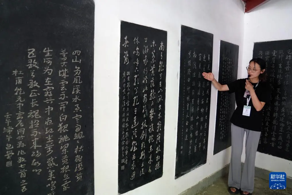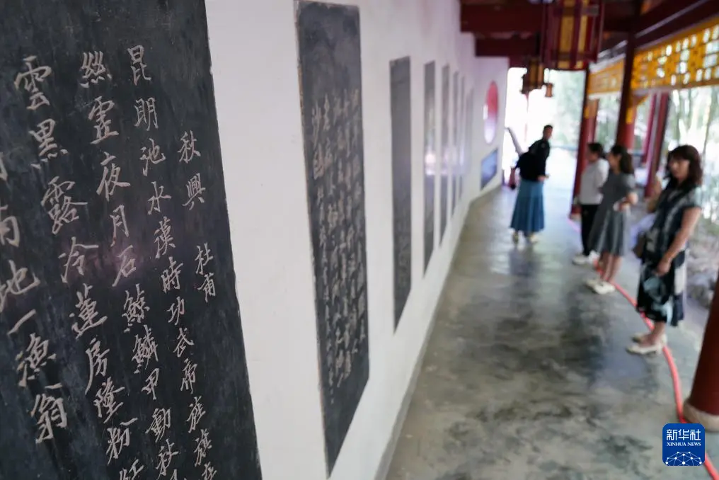 7月13日,游客在成县杜甫草堂景区参观杜诗碑林。