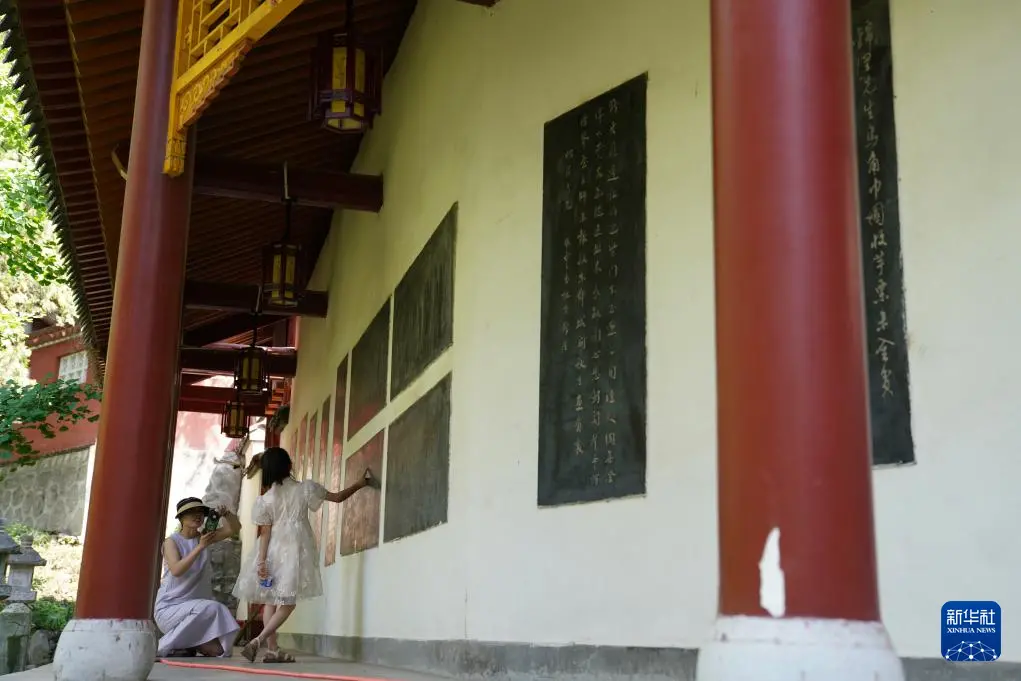 7月13日,游客在成县杜甫草堂景区杜诗碑林拍照。