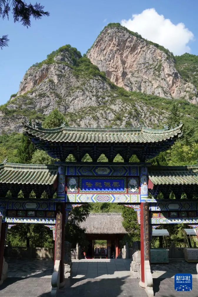 7月13日拍摄的成县杜甫草堂景区牌楼和对面的凤凰台,杜甫住在这里时曾写下《凤凰台》一诗。