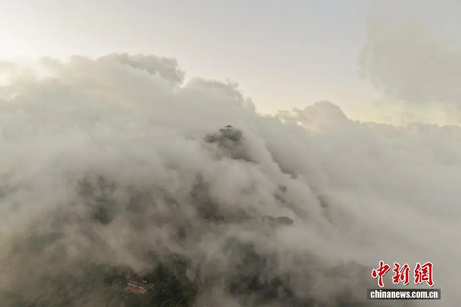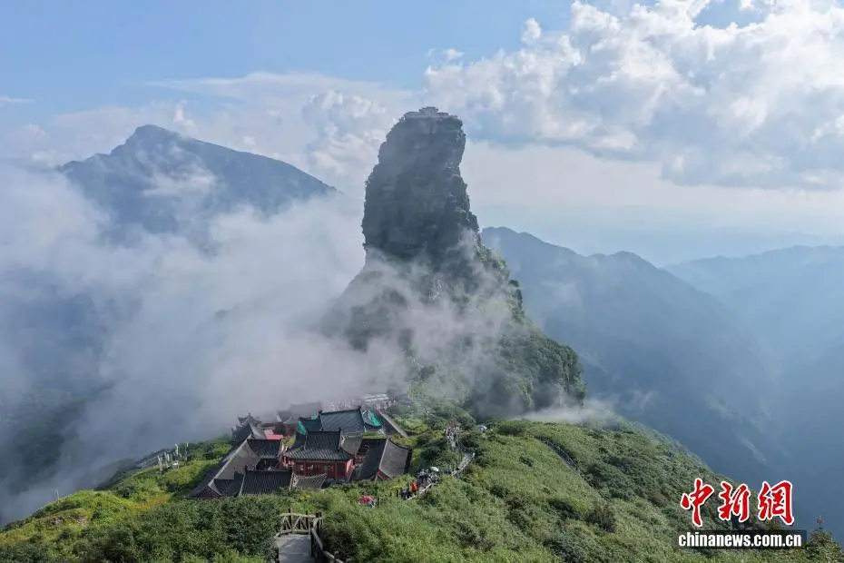 图为航拍梵净山老金顶在云海中若隐若现。(无人机照片)申逸恺 摄