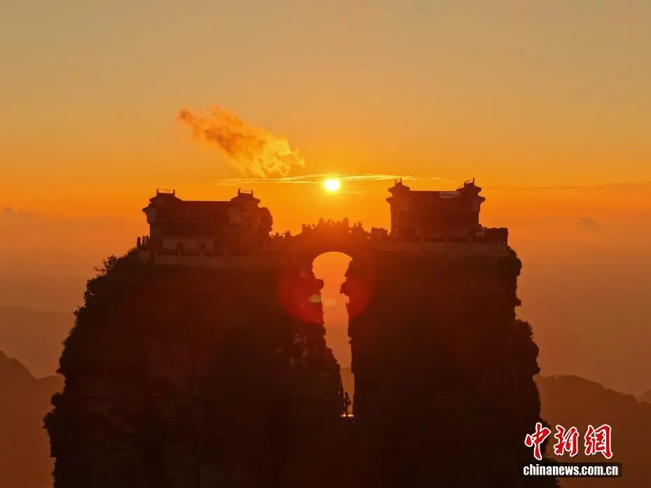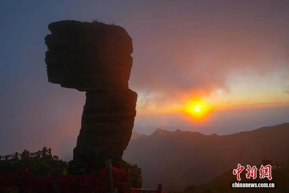 图为梵净山夕阳下的“蘑菇石”美景。(无人机照片)申逸恺 摄