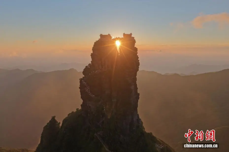 7月31日,贵州省铜仁市世界自然遗产地梵净山云雾似纱,美景如光影画卷。图为航拍世界自然遗产地梵净山红云金顶日落观景。(无人机照片)申逸恺 摄