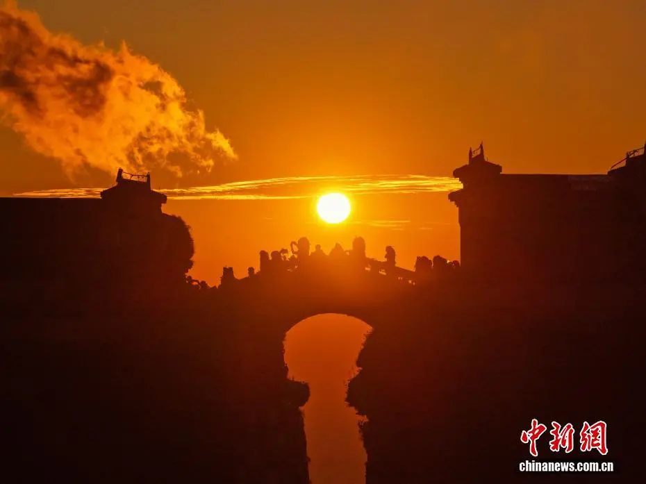 图为航拍游客在红云金顶上拍照游玩。(无人机照片)申逸恺 摄