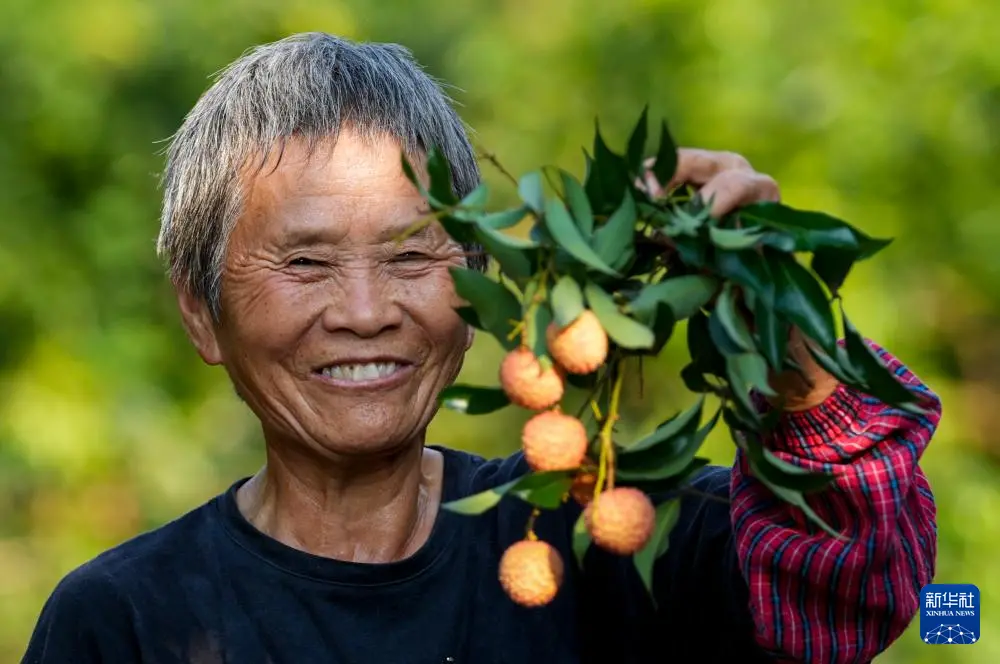 7月29日,重庆市涪陵区南沱镇睦和村村民在荔枝园内采摘新鲜的荔枝。