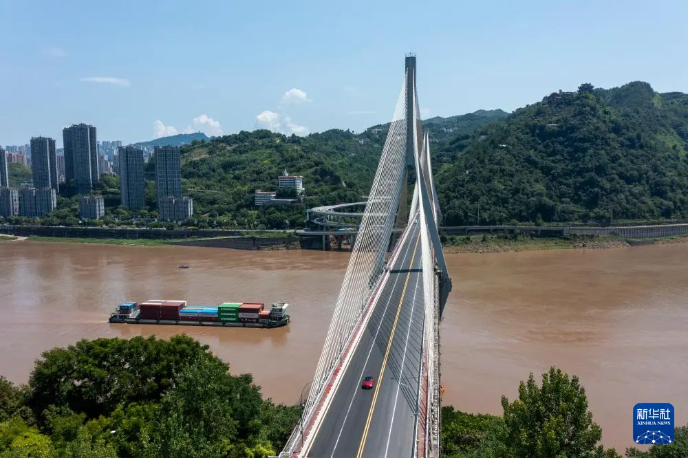 7月30日,一艘在长江上航行的集装箱货轮准备从重庆市涪陵区涪陵长江大桥下穿过(无人机照片)。