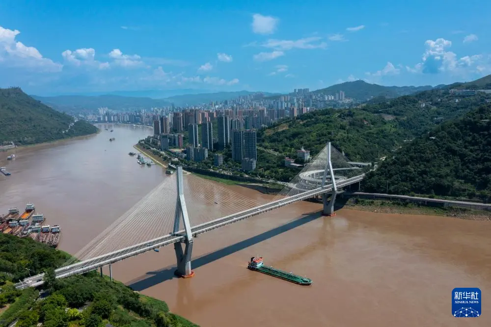 7月30日,一艘在长江上航行的货轮从重庆市涪陵区涪陵长江大桥下穿过(无人机照片)。