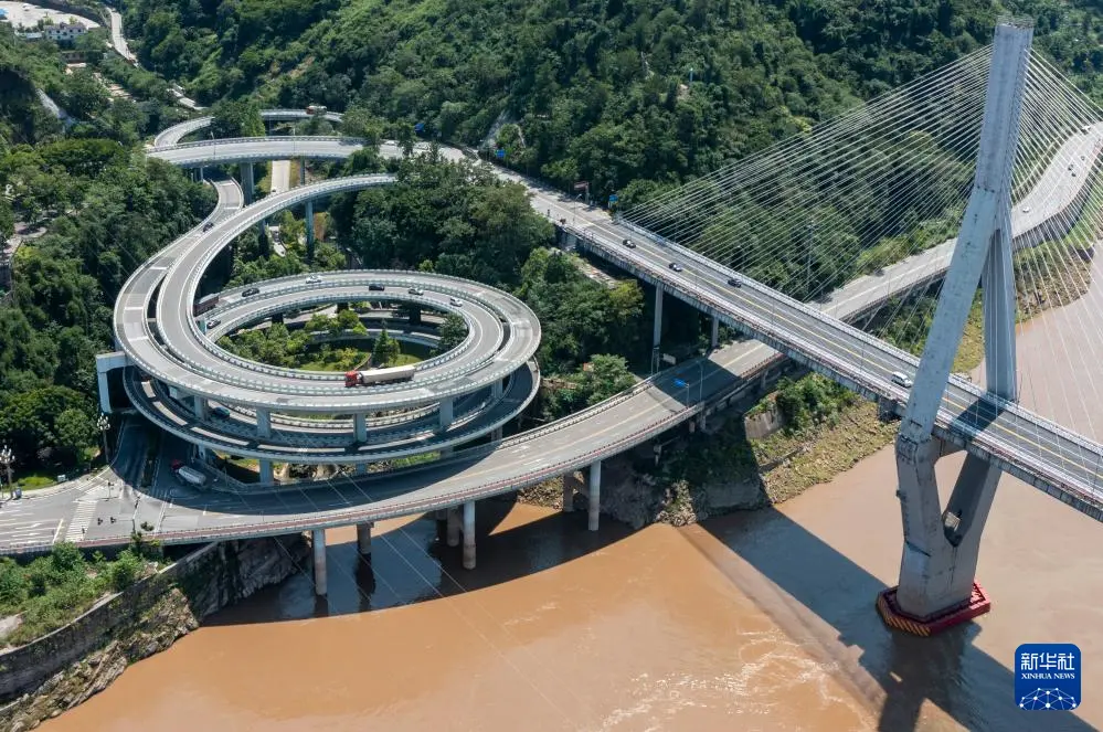 这是7月30日拍摄的重庆市涪陵区涪陵长江大桥桥头的公路立体交通(无人机照片)。