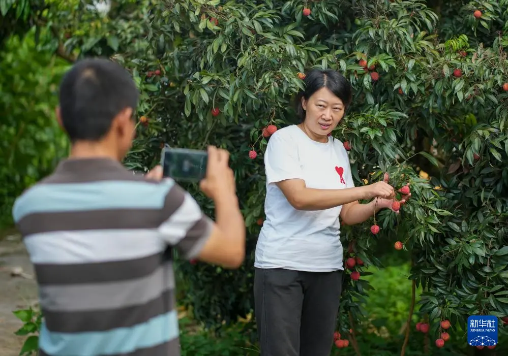 7月30日,重庆市涪陵区南沱镇睦和村村民汪登荣在荔枝园内拍摄短视频推介当地荔枝。