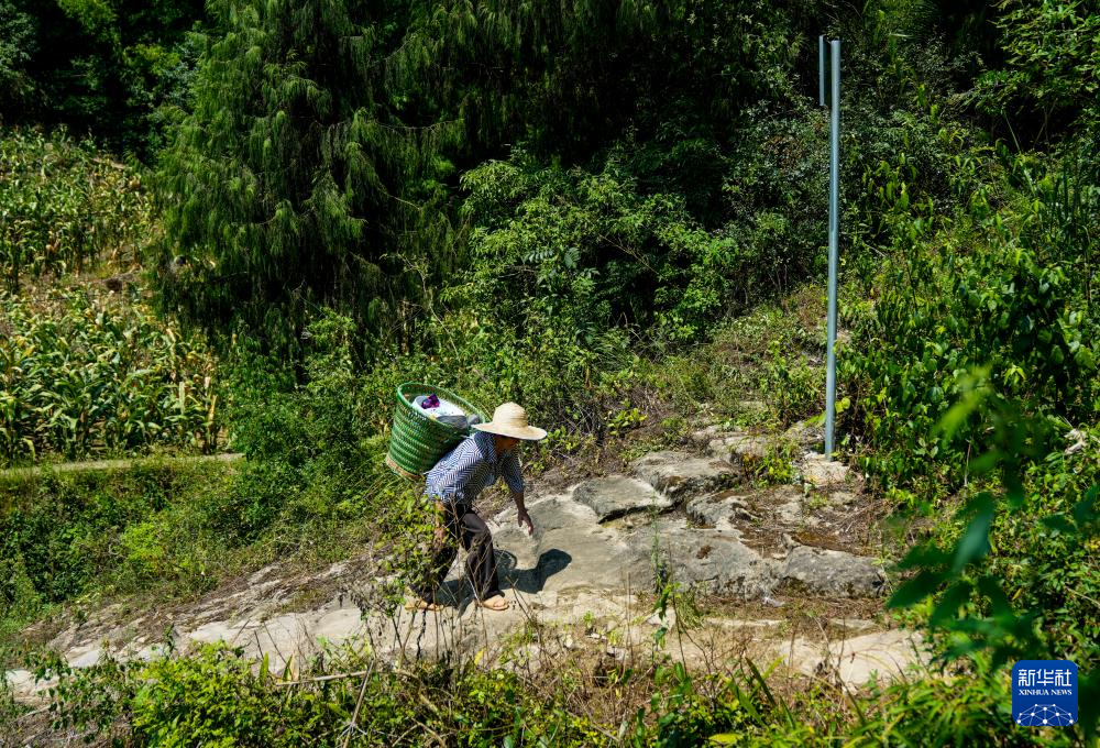 7月30日,重庆市涪陵区百胜镇村民背着背篓行走在一段古道遗址旁。