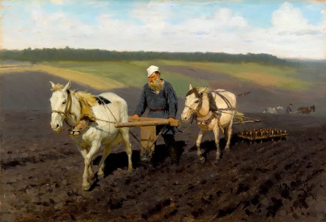 1887年8月的一个酷暑之日,列宾见证了震撼心灵的一幕——托尔斯泰在亚斯纳亚·波良纳庄园的黑土地上连续耕作六小时。画家迅速打开素描本,“不失时机地在马、犁、托尔斯泰、马、耙子这整支队伍经过他面前时,画下全部细节”。诞生于这次观察的《列夫·托尔斯泰在劳作》成为艺术史上最独特的文人肖像之一:头戴白色便帽的作家迎光扶犁,胡须飘在胸前,肥沃的黑土在脚下翻涌。托尔斯泰后来说,列宾对人民生活的描绘比任何其他俄罗斯艺术家都要好。