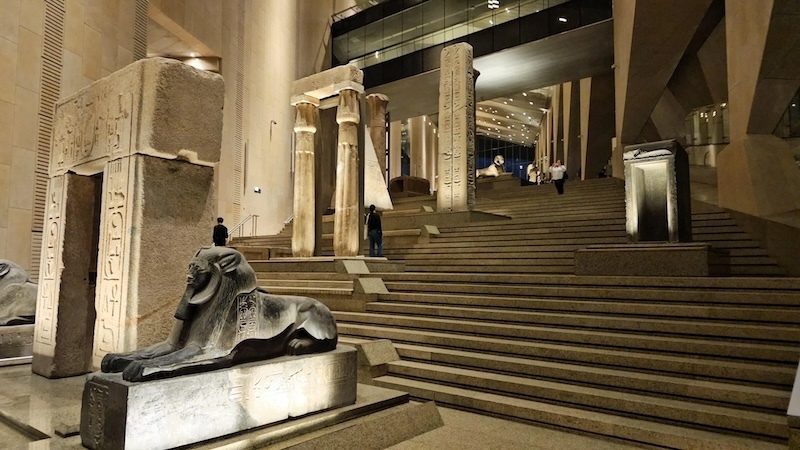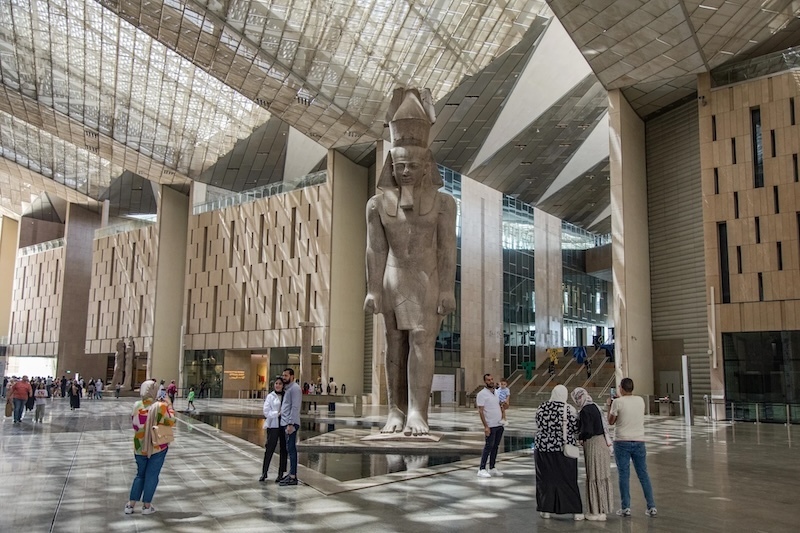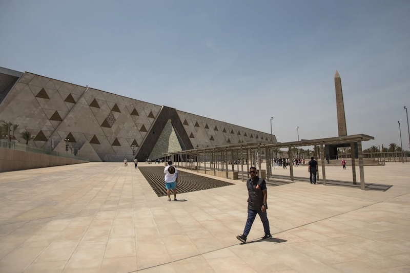 大埃及博物馆的建筑光滑如楔、外形锐利,石灰岩外立面上覆盖着互相嵌套的金字塔形图案,颇有几分机场或购物中心的模样,在棕榈树的掩映下,穿着制服的博物馆工作人员精神十足,高尔夫球车载着游客穿梭其间。