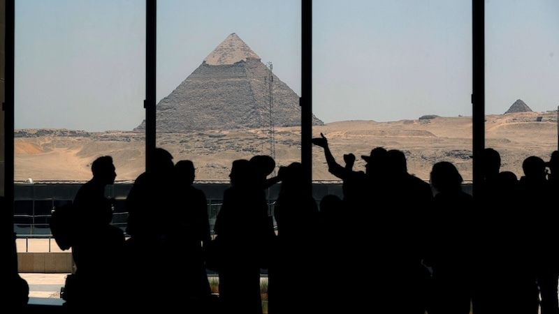 吉萨金字塔近旁,另一项时间要近得多的工程壮举——大埃及博物馆散发出威严与秩序感,使其从喧嚣混乱的首都脱颖而出。在开罗,没有任何地方能像这里一样让游客步行数公里而不被汽车喇叭、执着的小贩或酷热所打扰——更遑论在一座庞大、恒温、符合国际标准的建筑中参观了。宣传横幅和视频中高呼:“一个新的奇迹正在诞生”,以古代世界七大奇迹中唯一留存至今的金字塔作为比照。