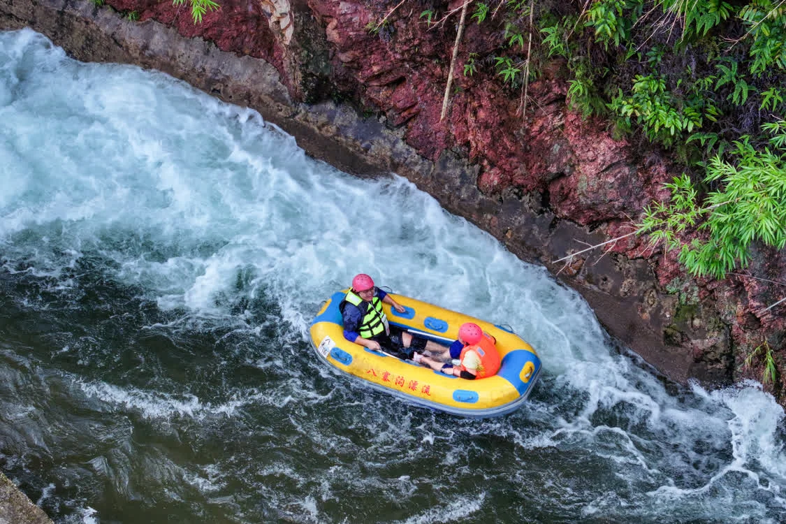 7月26日,在广西钦州市八寨沟景区,游客体验漂流(无人机照片)。新华社发(敖帅昌摄)