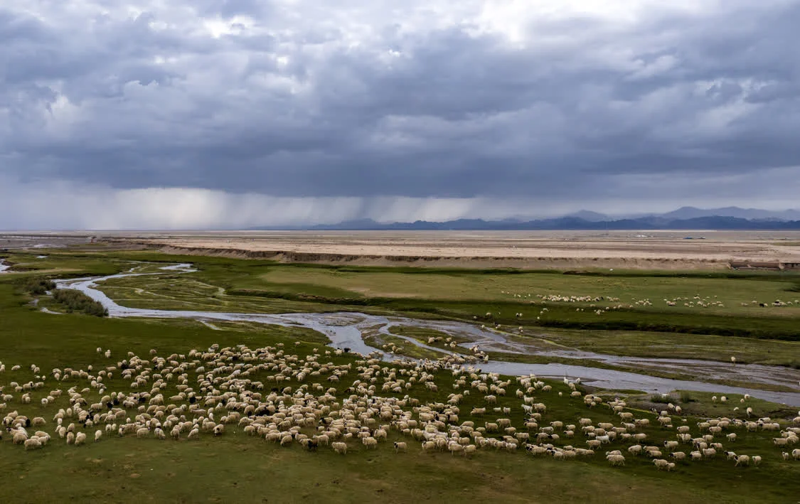 7月12日,在甘肃省阿克塞哈萨克族自治县阿勒腾乡哈尔腾村,羊群在夏日牧场吃草,远处正在降雨(无人机照片)。新华社发(高宏善摄)