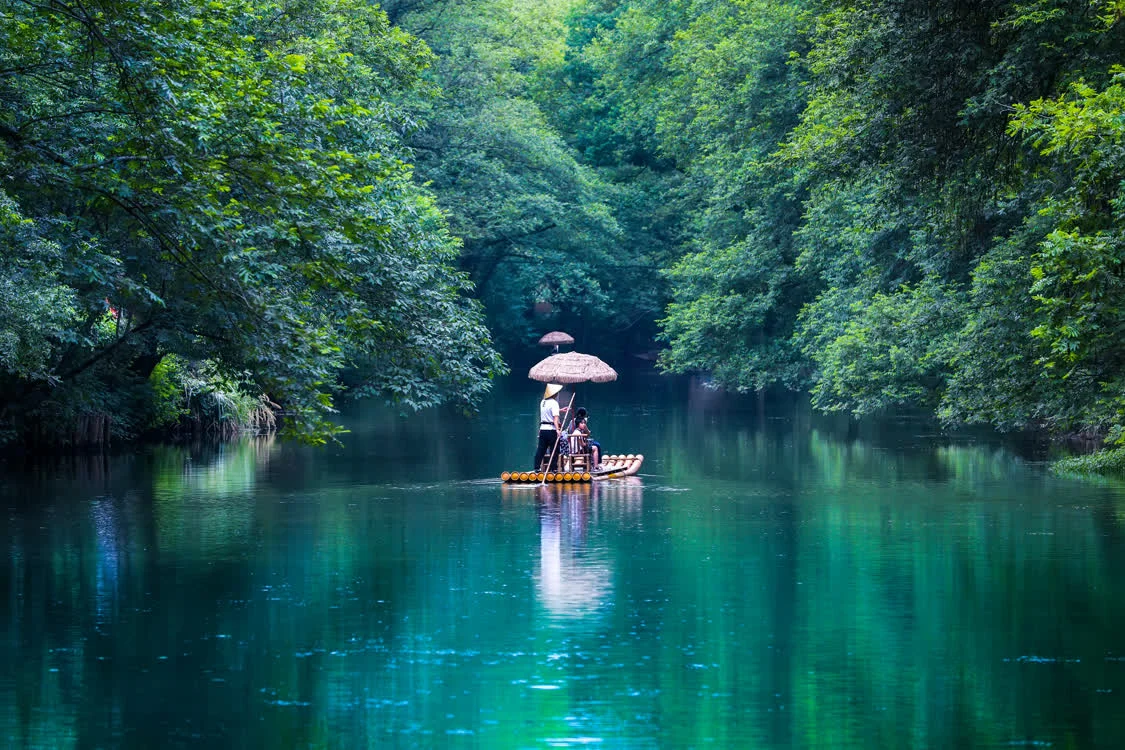 8月1日,游客在安徽省黄山市徽州区西溪南景区乘坐竹筏游玩纳凉。新华社发(樊成柱摄)