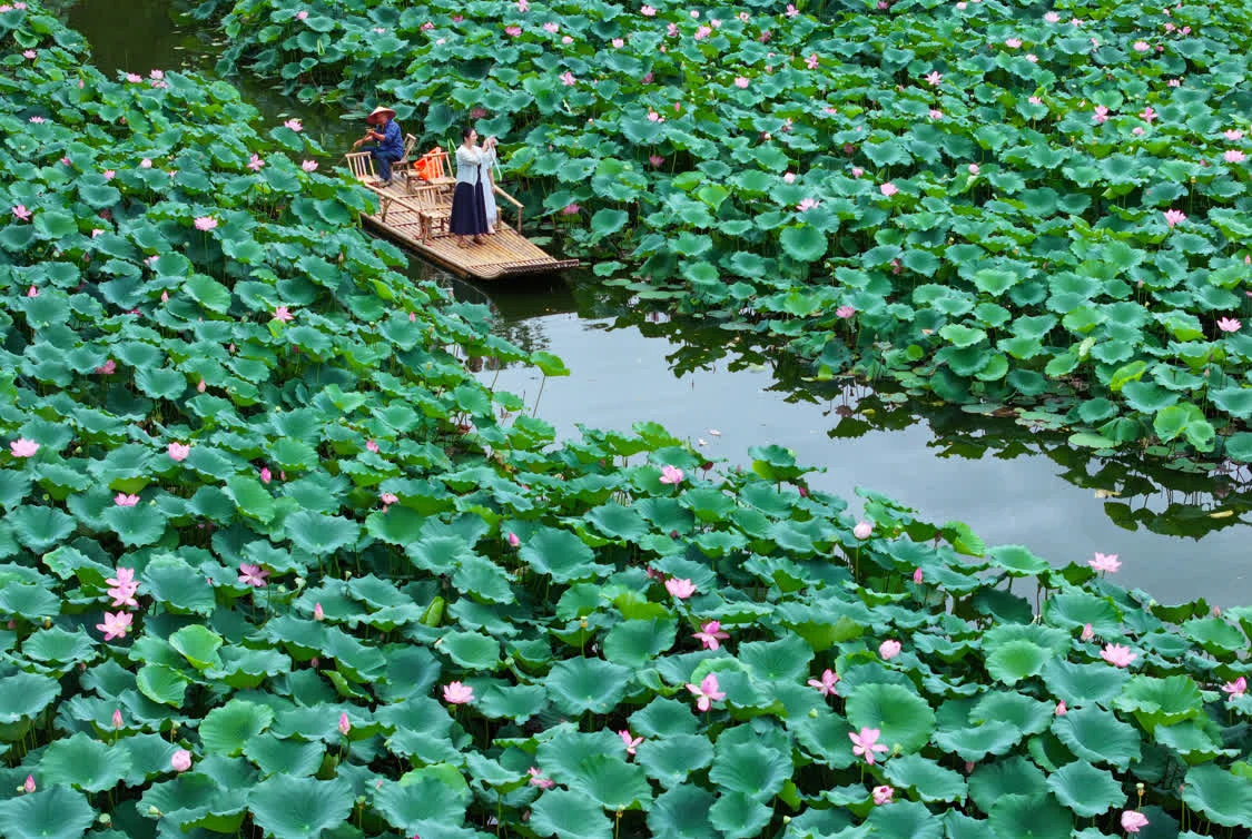 7月21日,游客在江苏省兴化市万亩荷塘景区赏荷游玩(无人机照片)。新华社发(周社根摄)