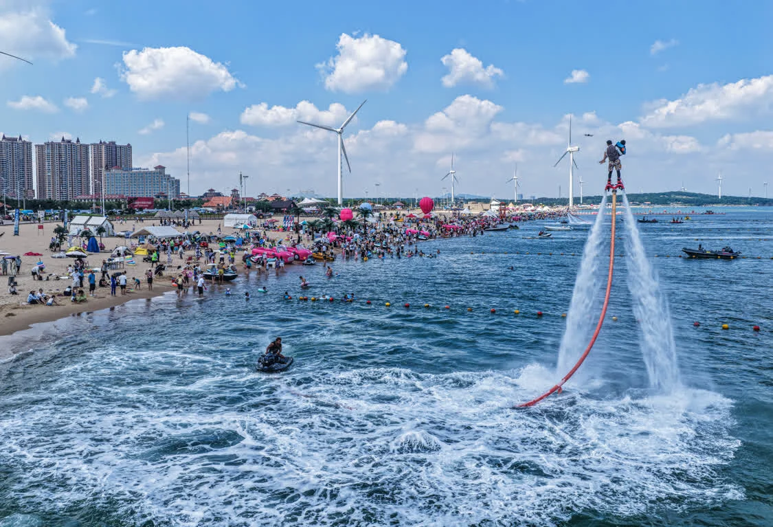 7月24日,在山东省荣成市那香海国际旅游度假区,游客体验“水上飞人”(无人机照片)。新华社发(李信君摄)