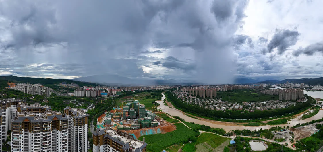 7月7日在云南省西双版纳傣族自治州景洪市拍摄的雨中景观(无人机全景照片)。新华社发(李云生摄)