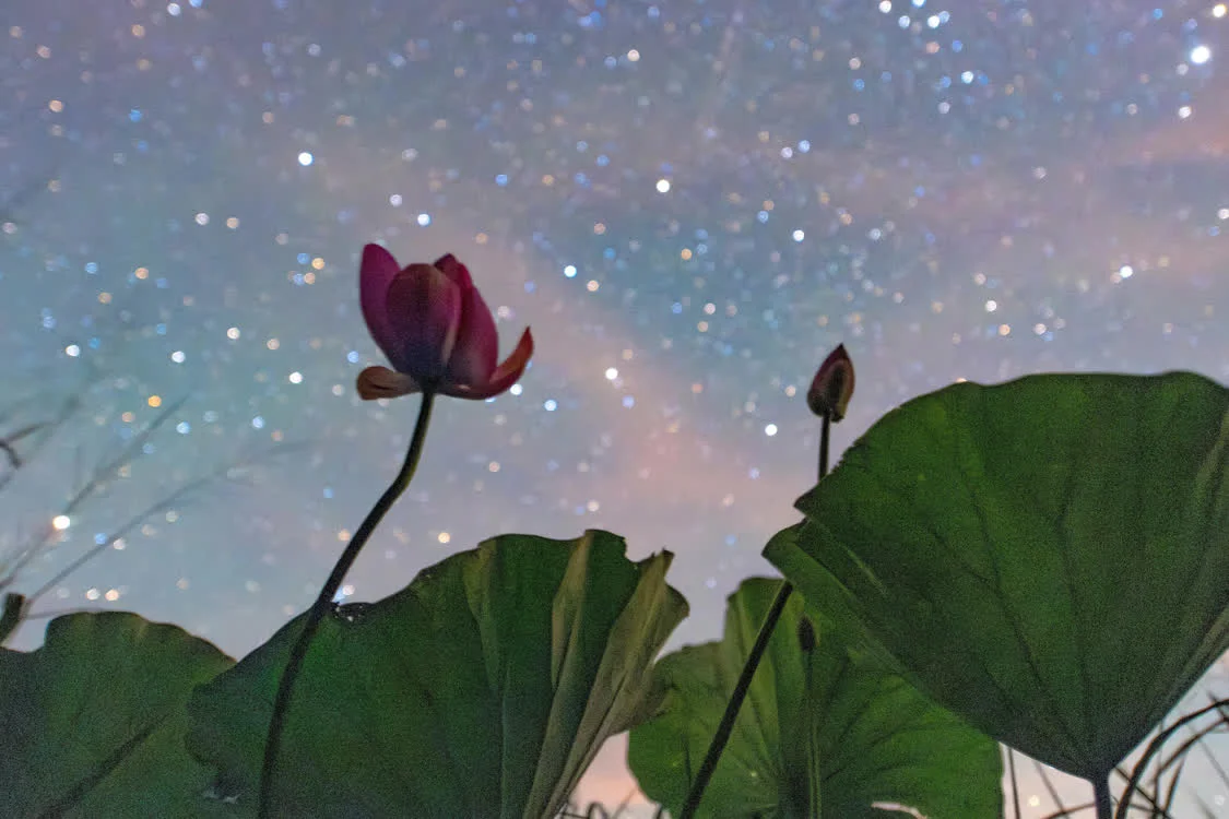 8月4日在位于黑龙江省富锦市的黑龙江三环泡国家级自然保护区拍摄的星空下的荷花。新华社发(曲玉宝摄)