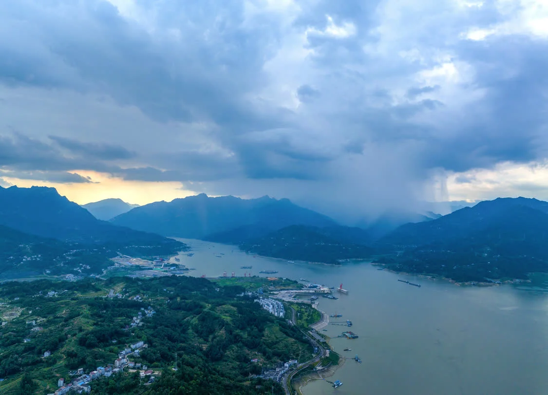 7月28日傍晚,长江三峡湖北省宜昌市秭归县水域附近呈现“东晴西雨”景观(无人机照片)。新华社发(王罡摄)