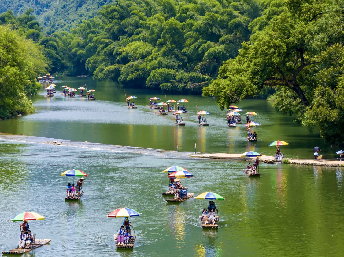 7月31日,人们在广西桂林市阳朔县遇龙河乘坐竹筏漂流(无人机照片)。新华社发(何华文摄)