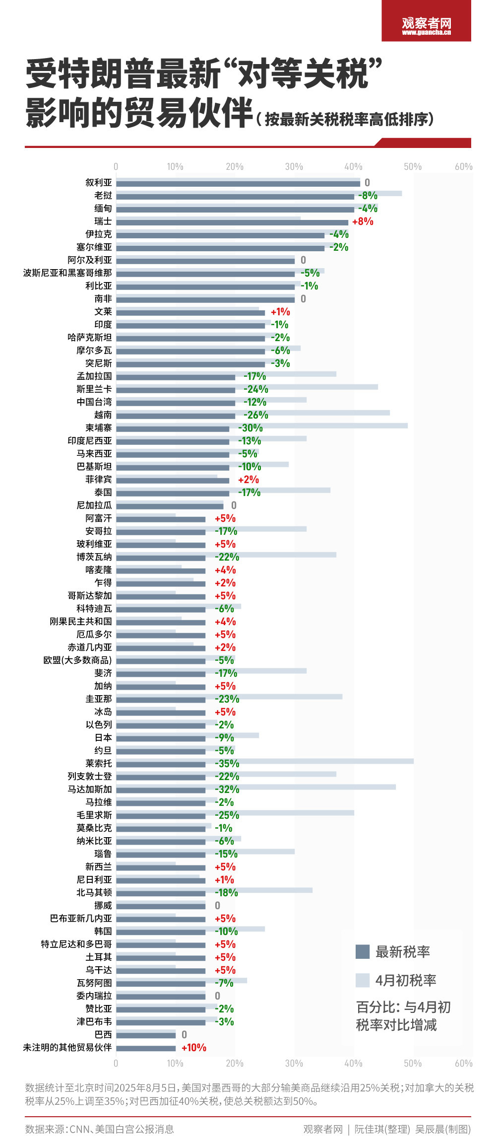 当地时间7月31日,美国总统特朗普签署行政令,确定了对多个贸易伙伴征收的所谓“对等关税”税率,具体税率从10%至41%不等。新关税将于当地时间8月7日生效。美方还表示,未列明国家及地区统一适用10%的关税税率。