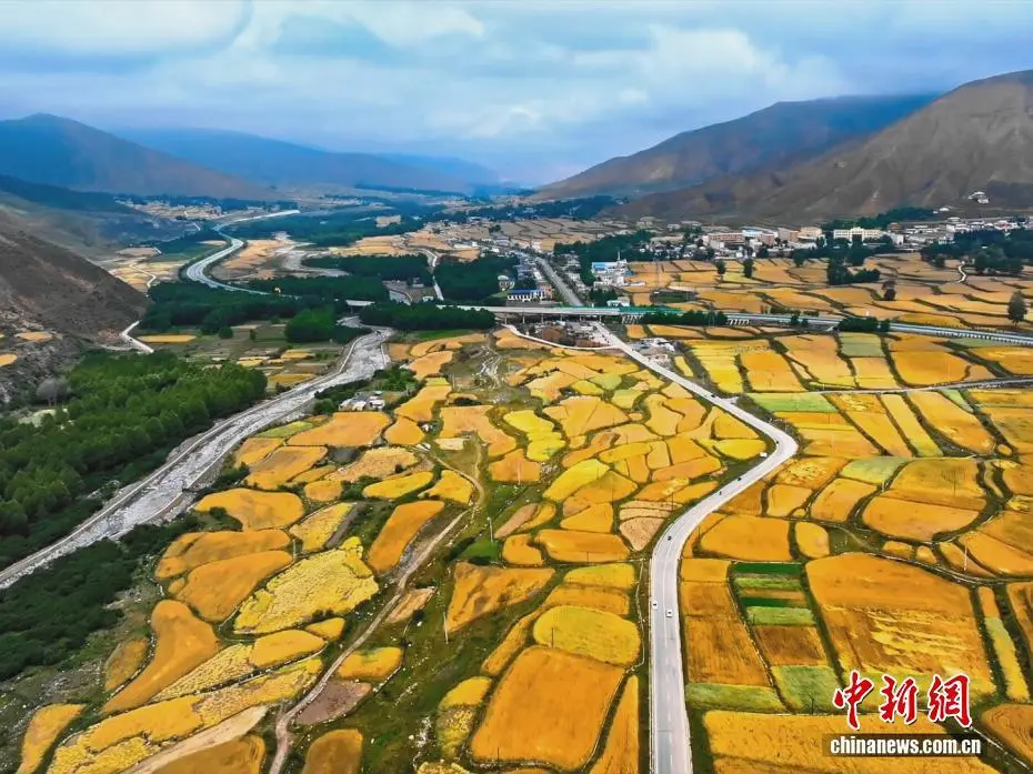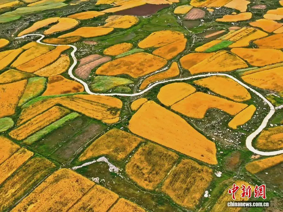立秋时节,青海省东部农业区的海东市循化撒拉族自治县境内,金黄色的麦田与油菜花田勾勒出一幅田园“丰景”,庄稼人迎来一年一度的收割季。循化县位于黄河上游的河湟谷地,这里土地肥沃、气候宜人,是青海省农业收割最早的地区之一。图为乡间道路在田块间蜿蜒。赵红莹 摄