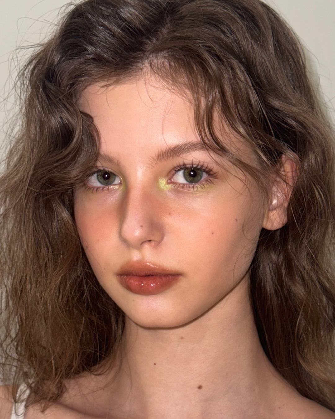 可露丽棕+彩色的入门款妆容,可以先从点亮眼头开始。这种将彩色偏光细闪眼影以“延长括号”为走向的画法,很多女明星都用在她们的春夏妆造里,妆效精致且不会喧宾夺主。