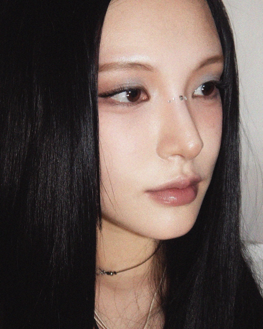 对于骨感不强的鼻型来说,硬描出直愣愣的山根绝不是明智之选。化妆师用暖棕橘色给娜娜打了“鼻背腮红”,巧妙地勾勒出她的鼻型,再用冷调高光点出山根和鼻尖,在肉感的基础上塑出立体度。