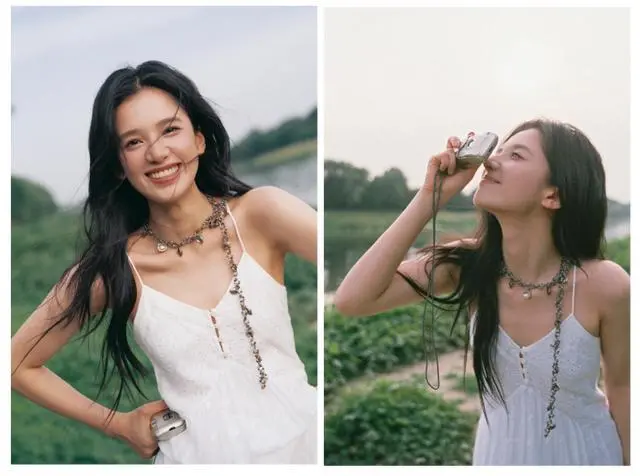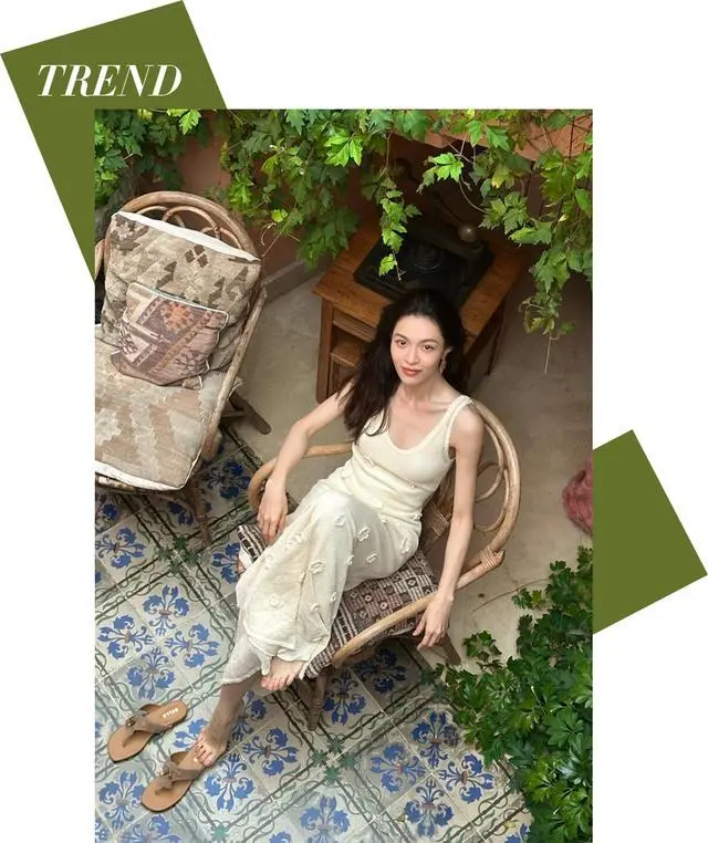 海岛风的清爽与纯净,是原始淳朴的质感与绿意所塑造出的自在氛围。张婧仪这身白色吊带长裙,仅靠自然的质感与简约的剪裁,就展现出随性的甜美,像藤条的长项链更为素雅的底色,注入一丝明快的温柔。