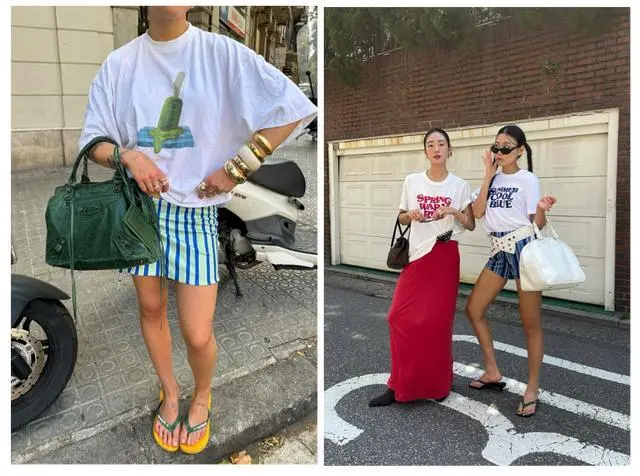 当想在炎热的天气里依旧穿出海岛风,一件宽松的T恤搭配短裙的简单造型,就可以穿出时髦感,大胆地尝试撞色,或者用明快的颜色混合搭配,适当地露肤可以很好地均衡整体造型的色调。