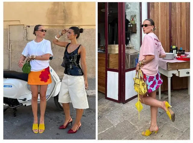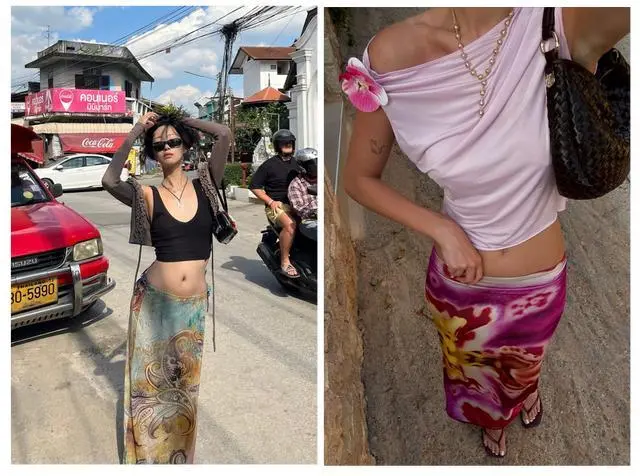 贴合臀胯的H形半裙,以缠腰设计修饰身材,搭配短款露脐针织衫或系带抹胸,大胆地露出腰线 ,印花的图案可以选择更有氛围感的款式,高饱和度的红、橙或玫红为色调的印花,轻松肆意。