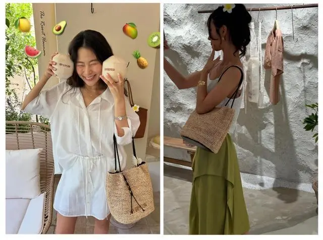 除了清爽的面料和印花图案,草编的配饰,以及一些具有海岛风格的元素,则能为造型增添自然纹理和手工艺感。沈月这身造型就很好地“压题”海岛风,在简单的基础穿搭上,增加一条格子丝巾,再搭配一件精巧的编织开衫,看似随意的细节立刻为整体注入浓郁的热带岛屿气息。