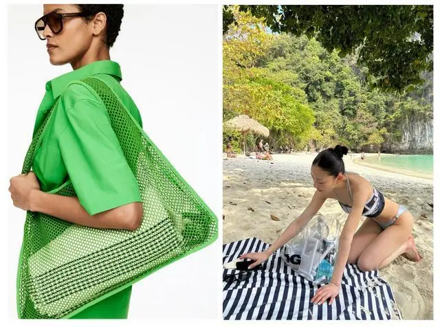 网格袋和透明材质的背包,它们独特的材质特性赋予造型十足的呼吸感,视觉上轻盈通透,实用上也兼具容量。即使穿着非常简约的基础款,搭配这样一只具有未来感或休闲感的透明包包,也能立刻打破单调,让整体造型显得别致有趣。