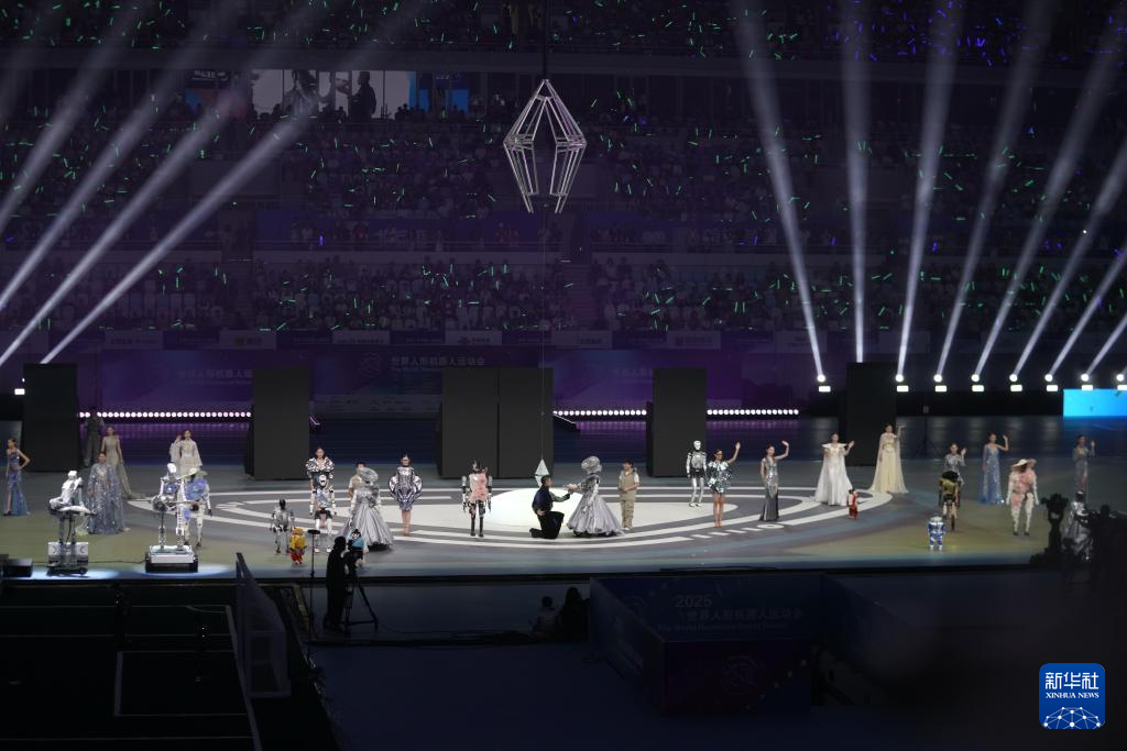 歌舞节目《欢迎来到碳基生命的世界》中,人类舞者与机器人以流畅协作演绎“碳基与硅基的对话”;服饰走秀节目《天工霓裳》则将非遗技艺与未来设计完美融合……14日的开幕式上,超百支战队闪耀“冰丝带”,各式机甲竞展风采,机器人街舞、戏曲轮番登场,更与专业街舞团联袂献艺,生动演绎科技与人类文明的碰撞交融。随着舞台中央的“智芯”装置——镶嵌蓝色晶体芯片的金属四棱锥被点亮,2025世界人形机器人运动会正式启动。