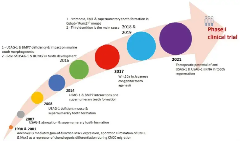 其中进展最快的,是文章开头提到的日本大阪大学的研究,他们在动物模型上完成了整颗牙再生的突破(含牙髓、釉质、牙本质),提出了「牙再生抗体注射液」概念。