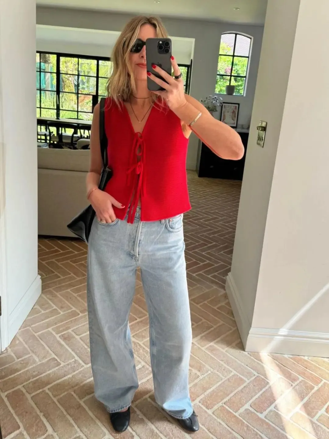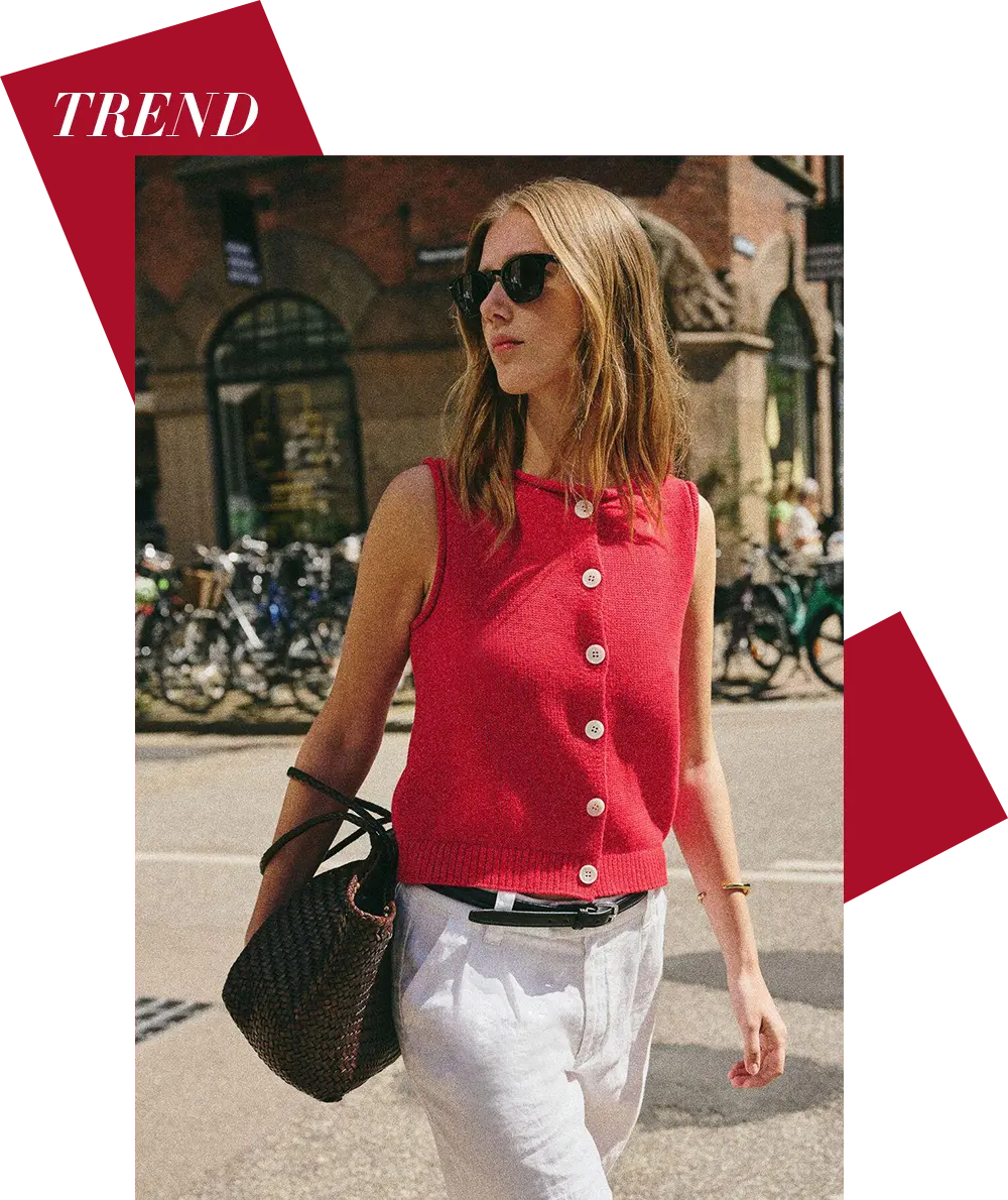 像李兰迪这样把樱桃红单品作为上半身的色彩重点,明亮的红色将肌肤衬得通透白皙,简约而不简单。