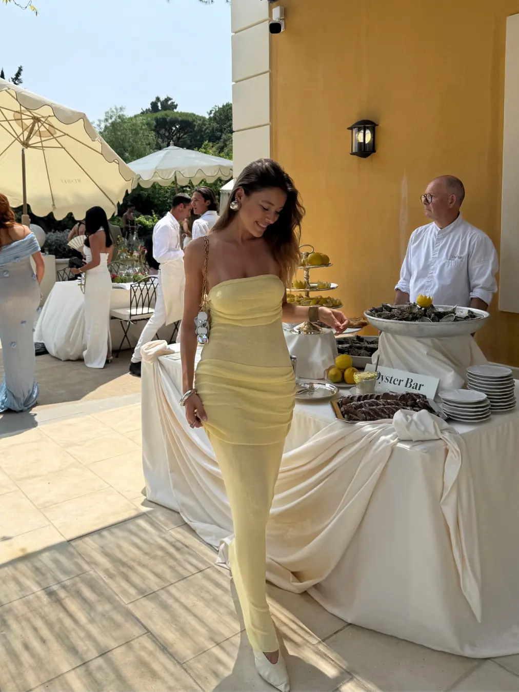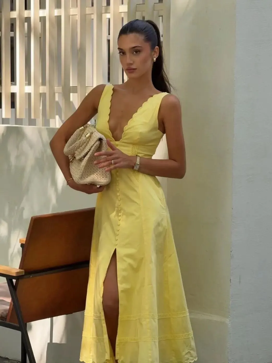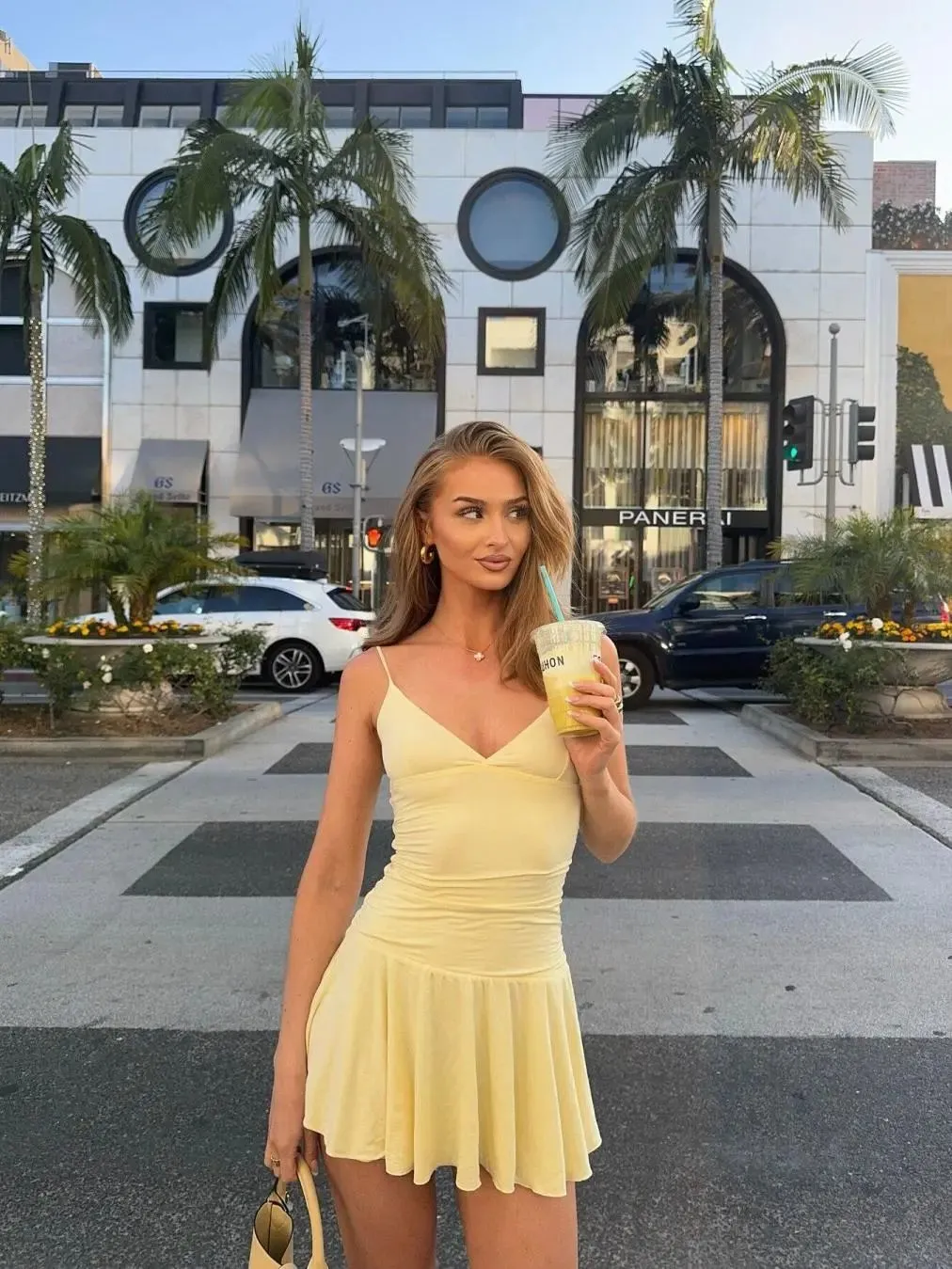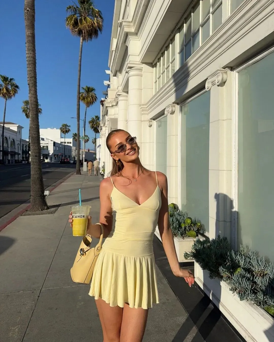 柠檬黄已经成为了夏日标配色。轻盈简约的纯色连衣裙或是吊带裙,如同散发着柠檬香气,整个氛围感立马到位。