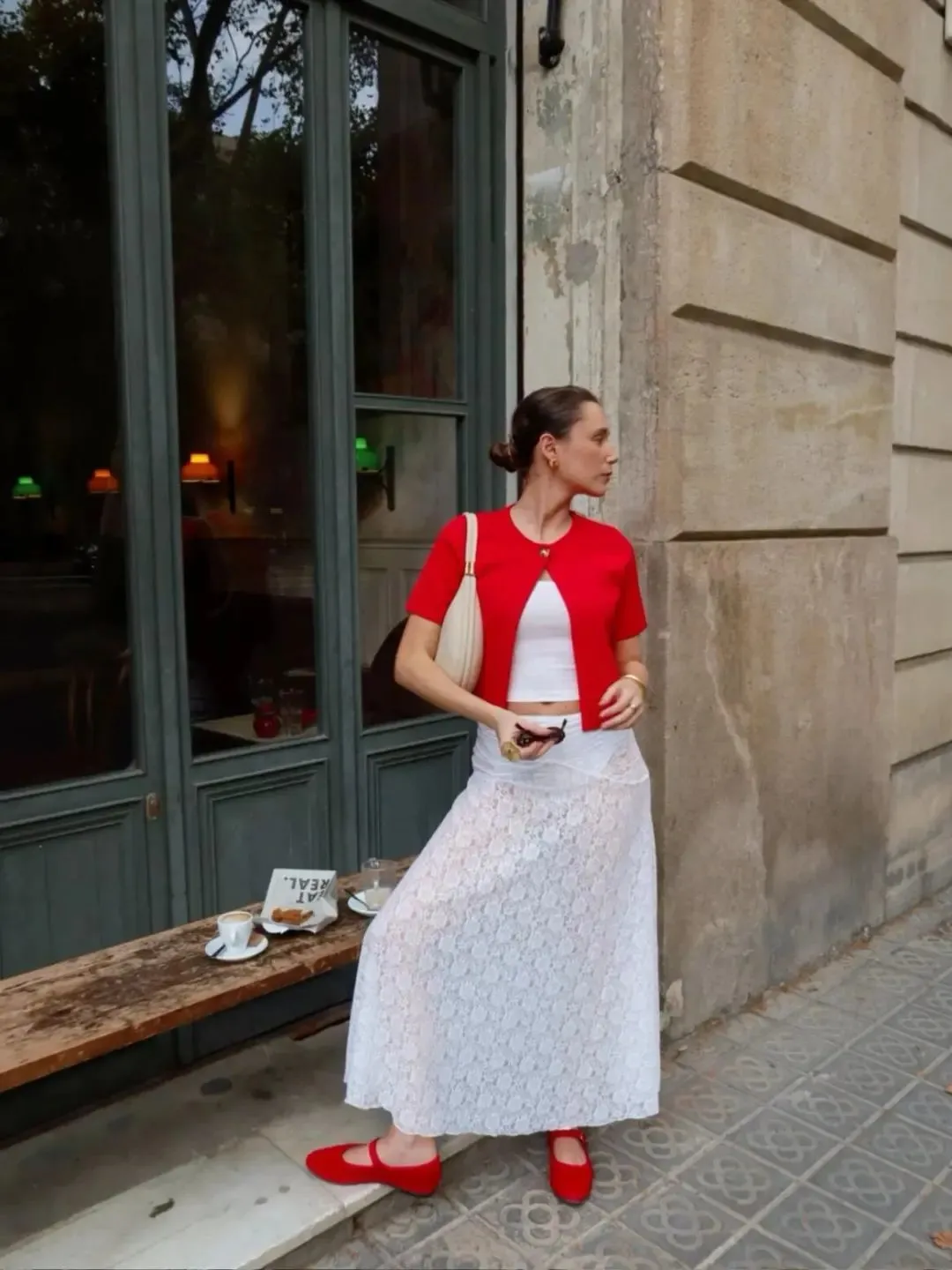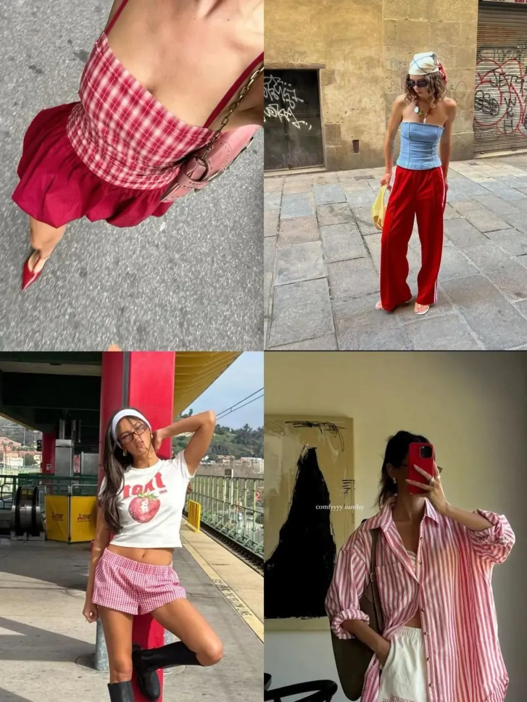 夏日穿搭怎么能不提樱桃红半裙?用基础款搭配红裙也是打造元气感的时髦公式。