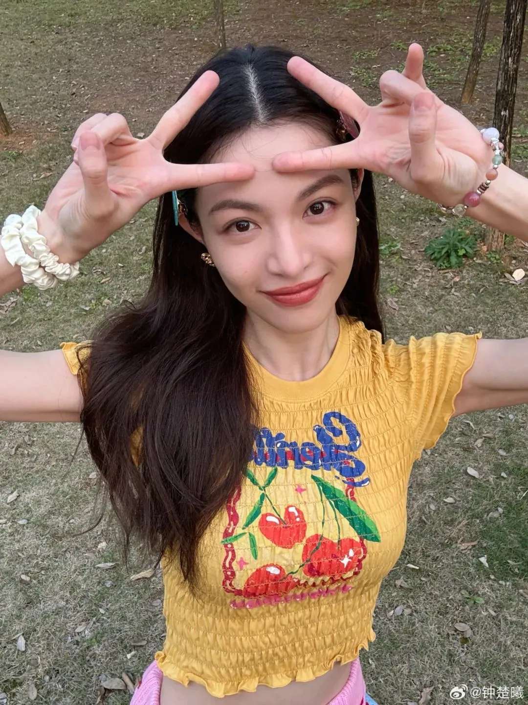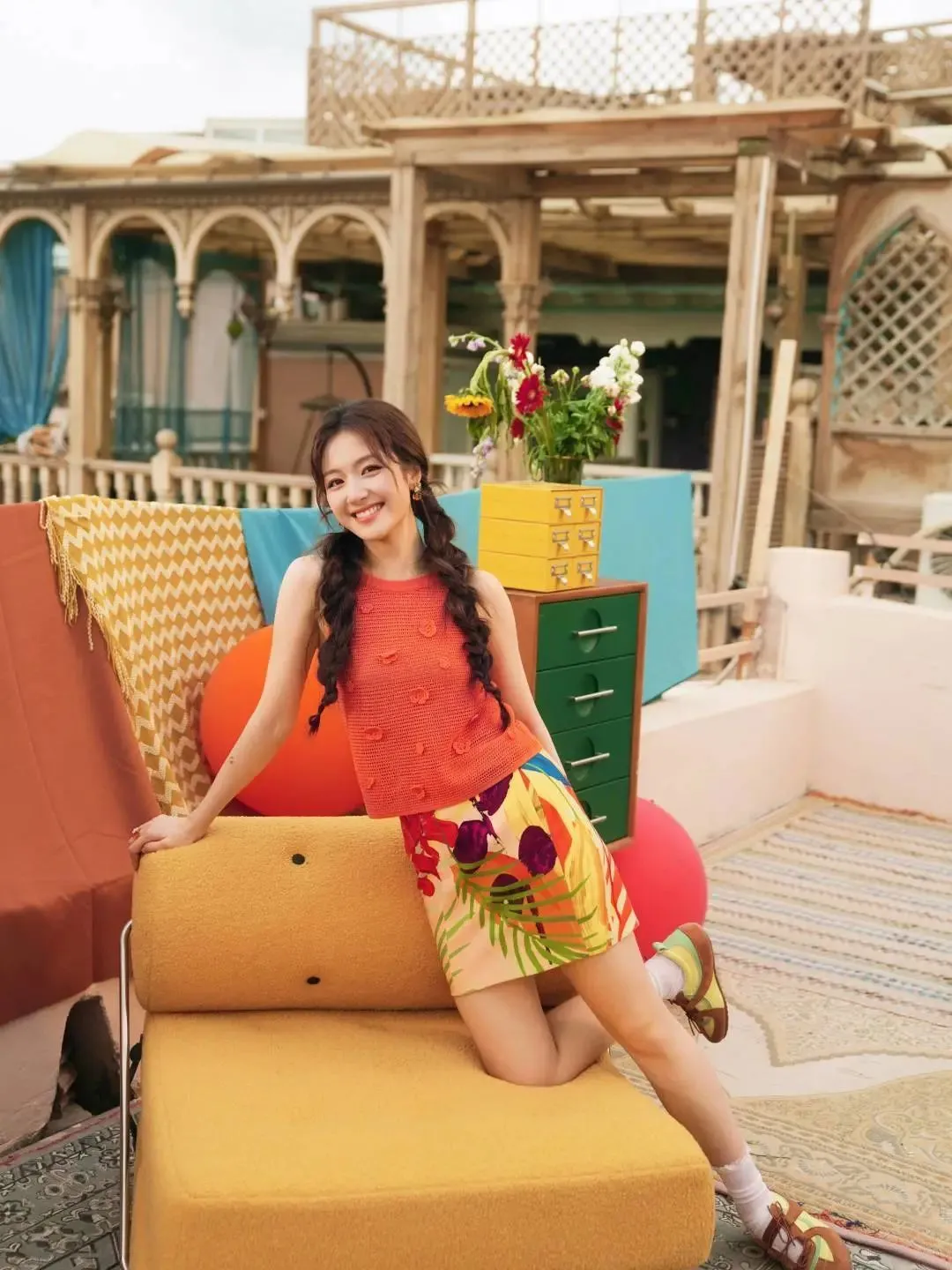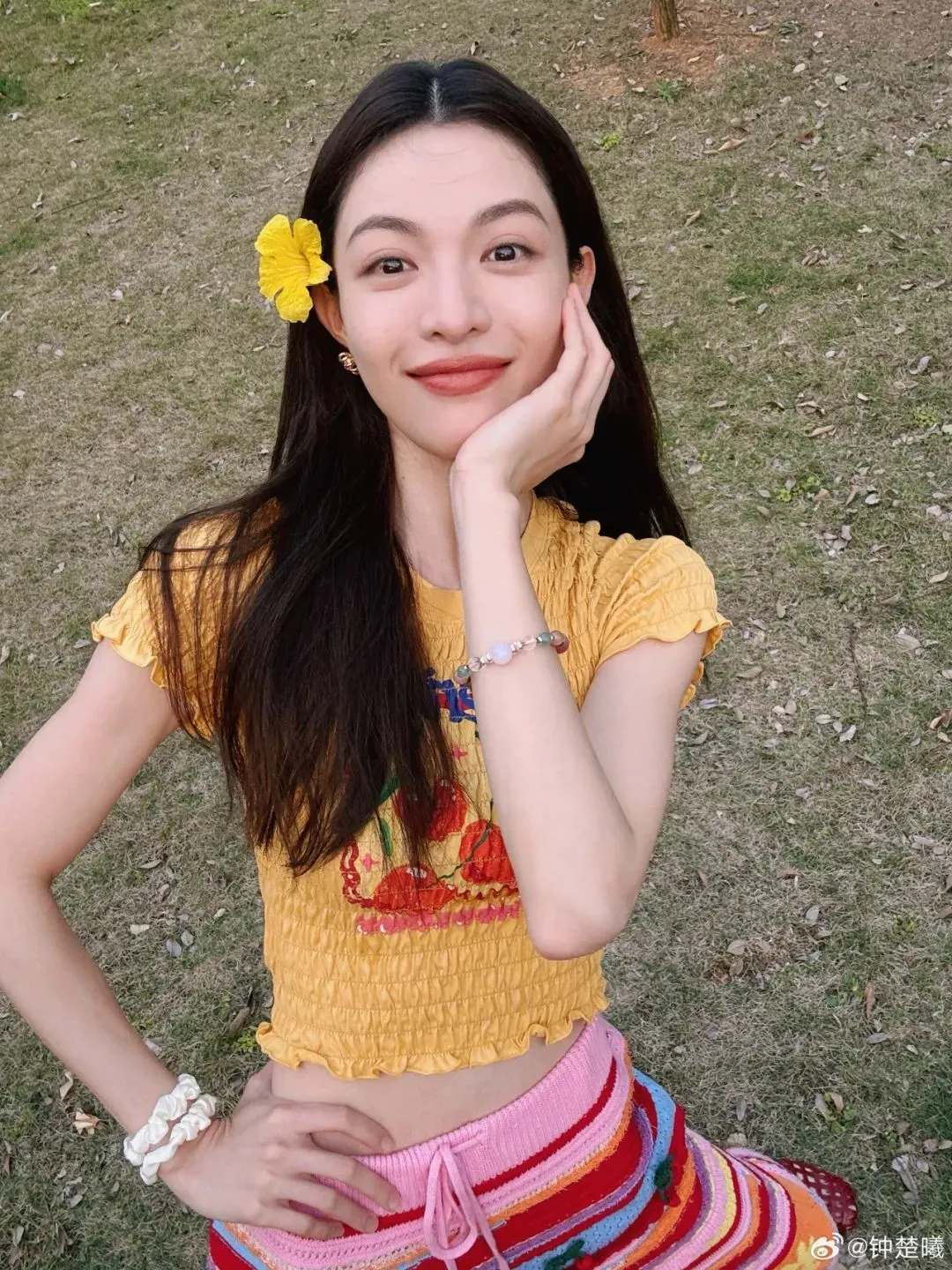 “夏日模式”的钟楚曦也是妥妥的“水果味女孩”穿搭。印有樱桃图案的黄色褶皱上衣、色彩缤纷的针织裙、樱桃红碎花连衣裙,明媚的夏日气息扑面而来。