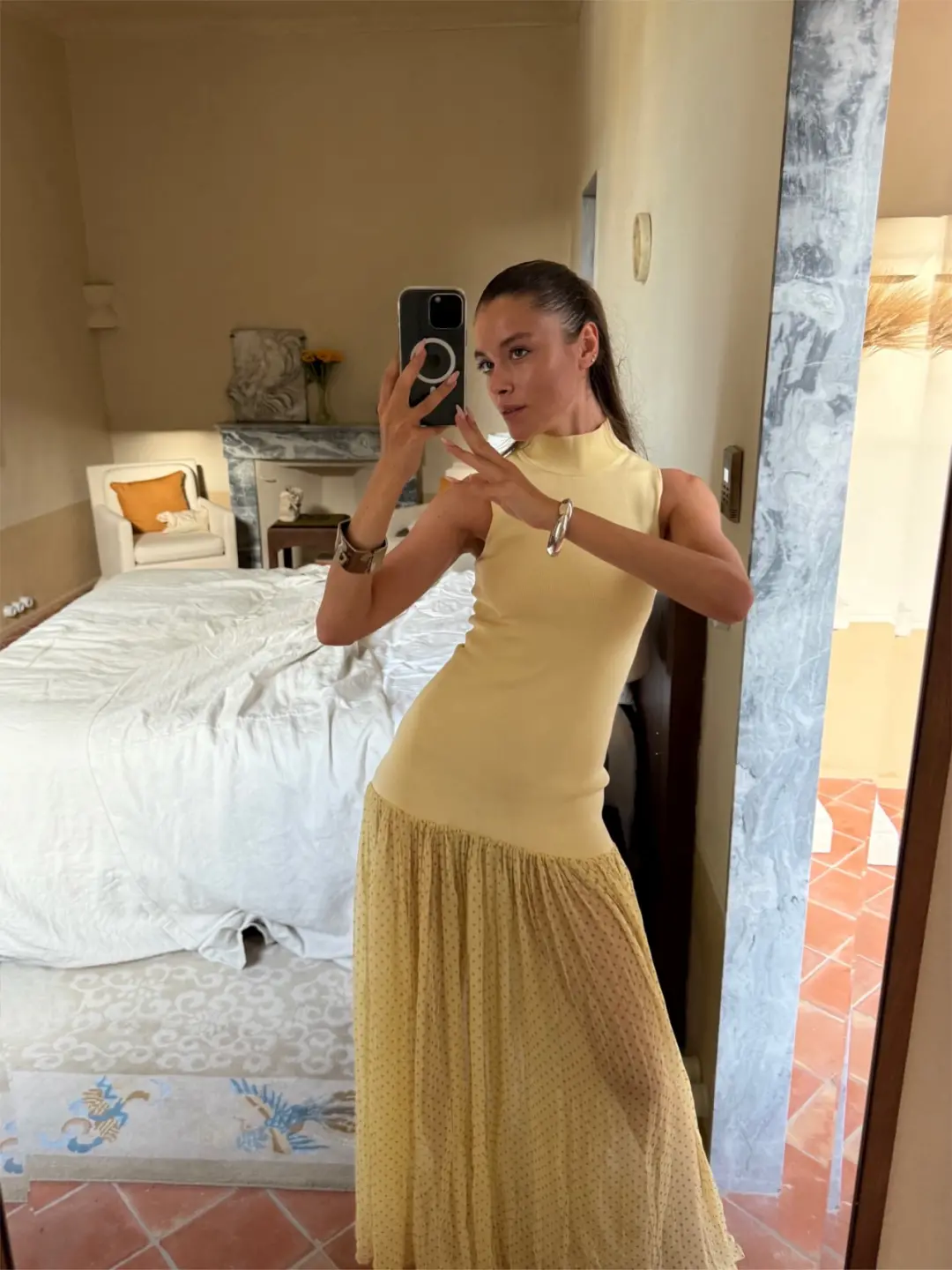 不同材质也能穿出不同风格。针织的柠檬黄温柔,棉麻材质更飘逸,皮革材质则是有一点个性。搭配金属感凉鞋,整个人瞬间变得明亮又干净。