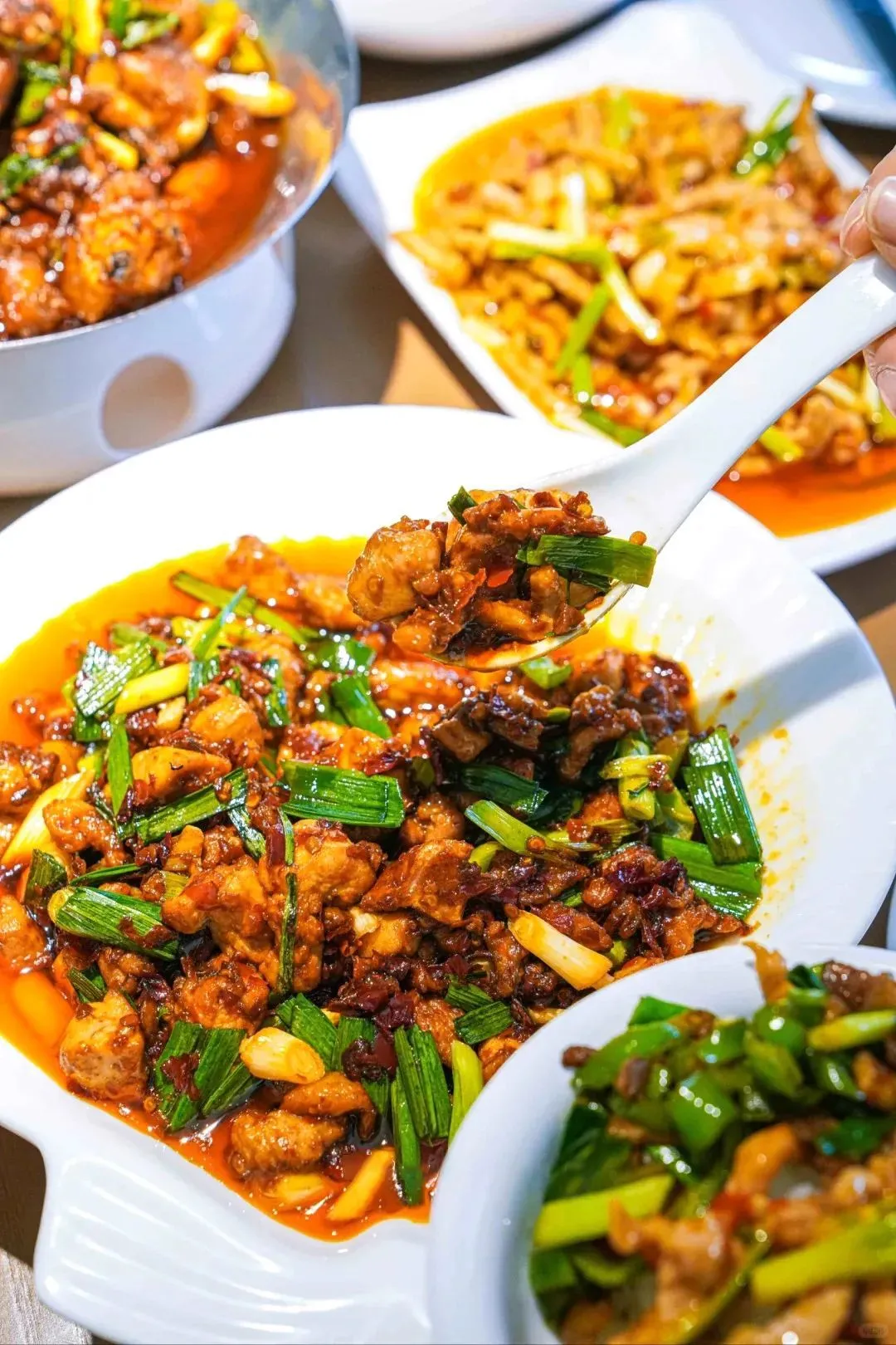到贵阳城北,阳朗辣子鸡转为猛火爆炒。鸡肉先炒干,再经高压锅压熟,灵魂调料糍粑辣椒再次登场,爆炒出香气,鸡肉回锅历经“三翻九转”,这盘辣子鸡裹满辣椒和香料的滋味,又耙又糯,是一记“色香味”的组合重拳。