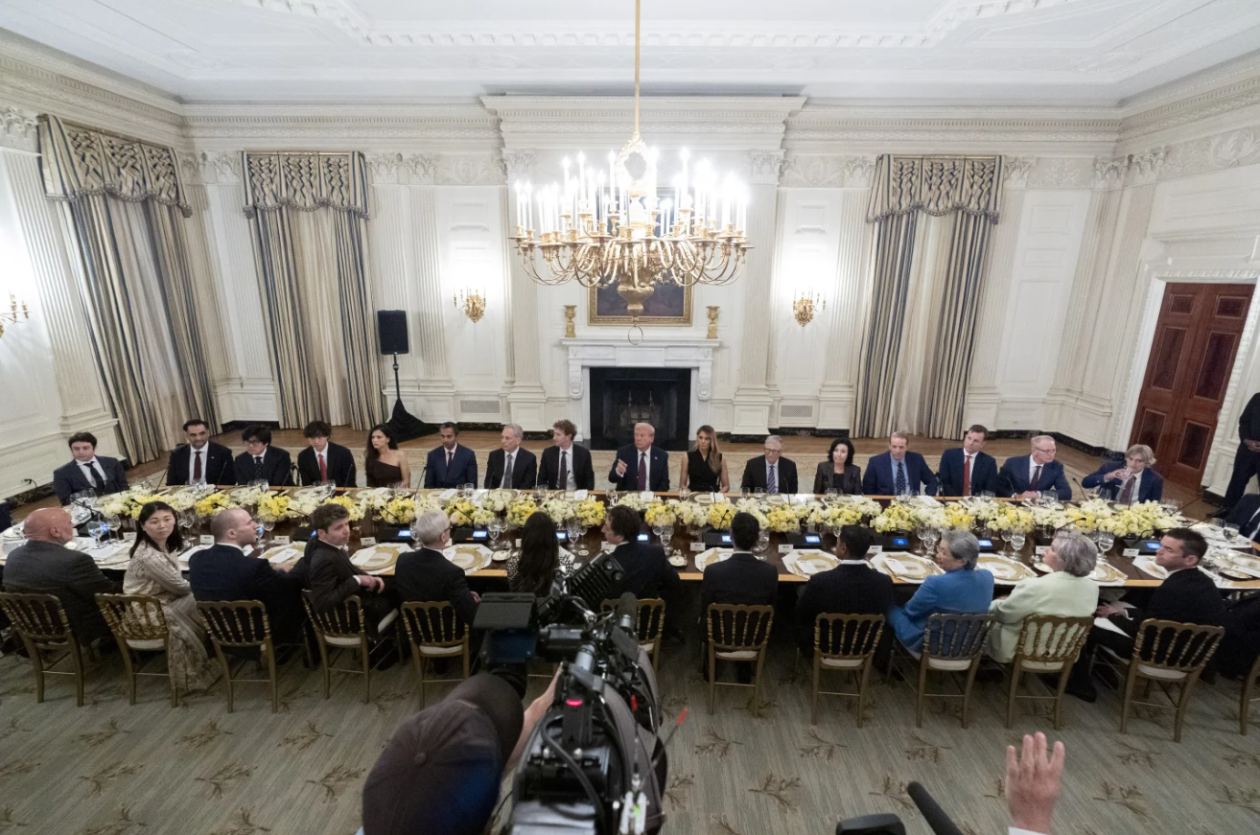 当地时间9月4日,白宫举行科技领袖晚宴。美联社称,该活动原计划在玫瑰园举行,后因天气原因转移至白宫国宴厅。图源:美媒