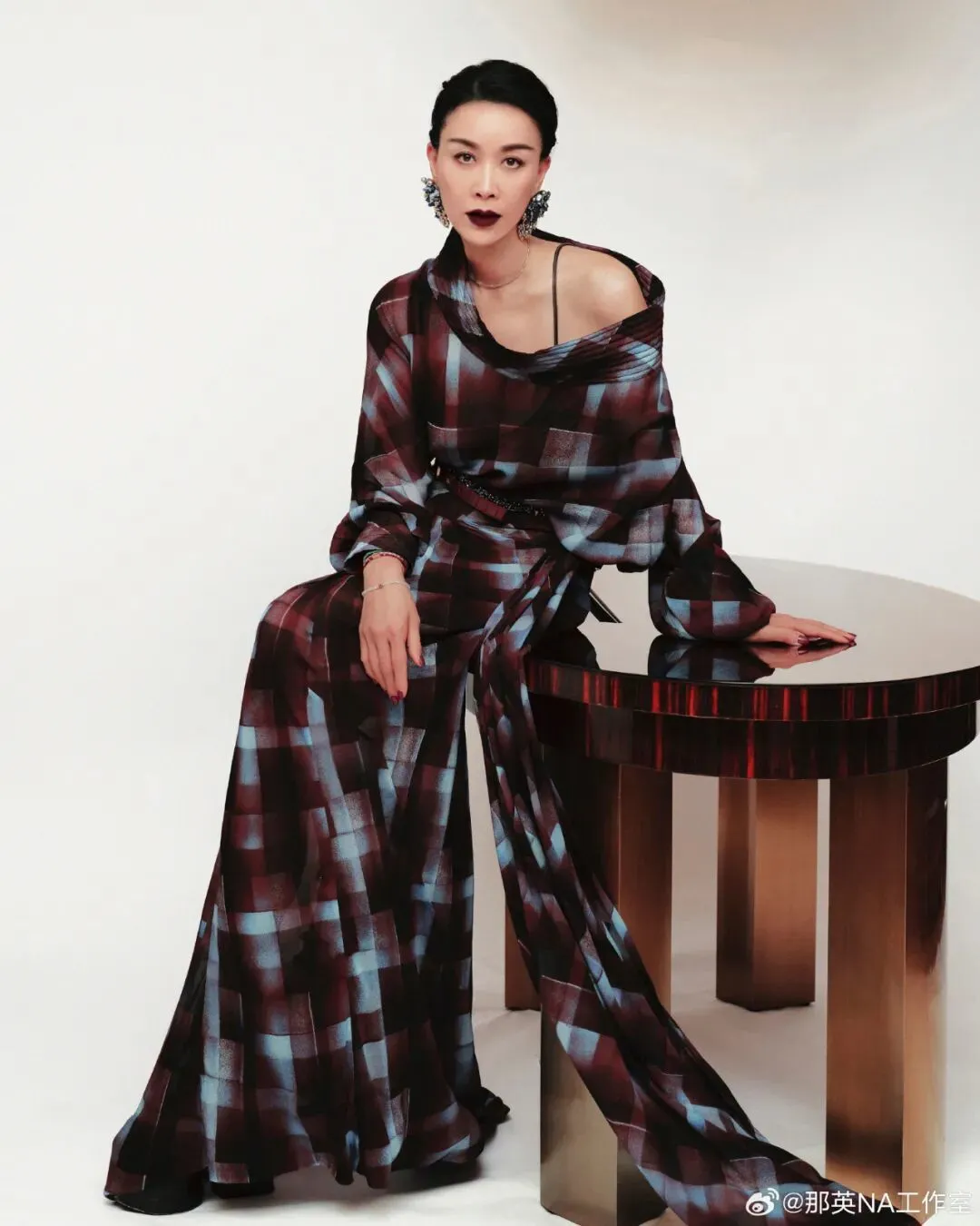 即便是经典的格纹元素,那英也用了不对称的裙摆和同色系的靴子,来制造出“艺术生”的感觉。