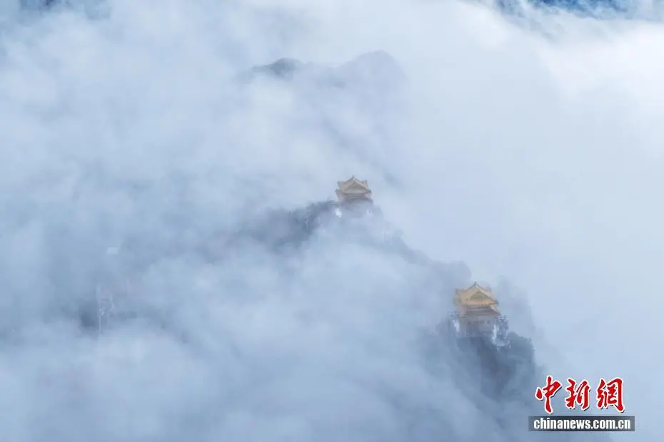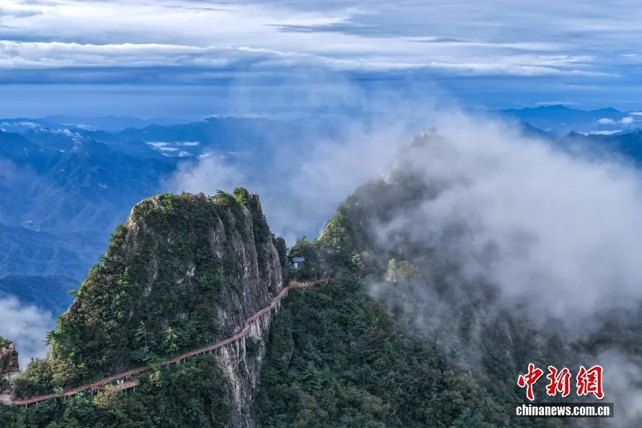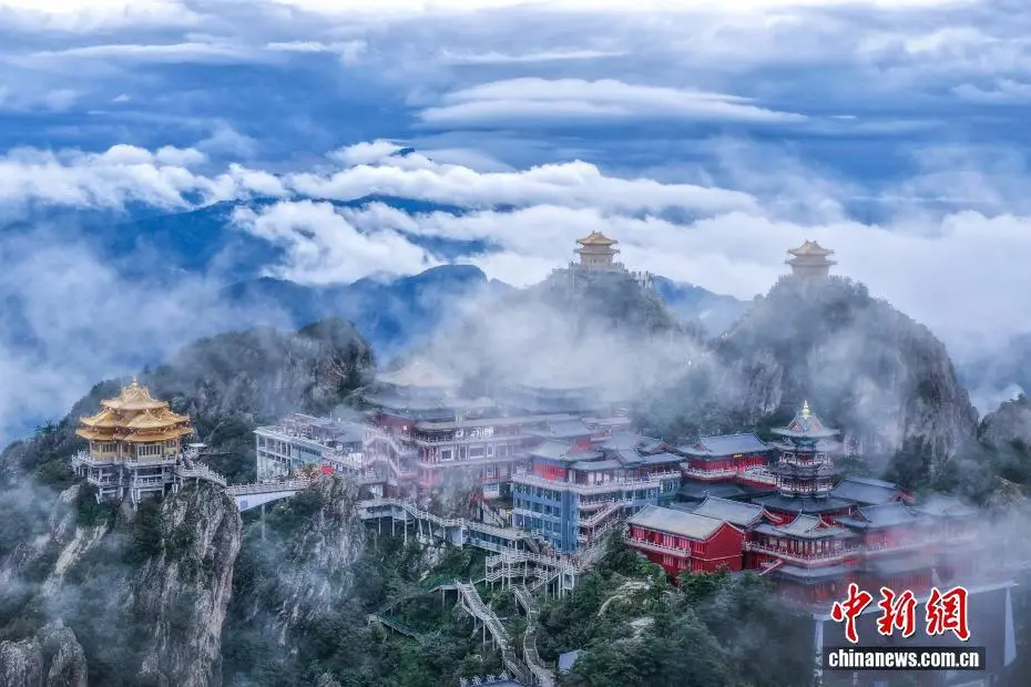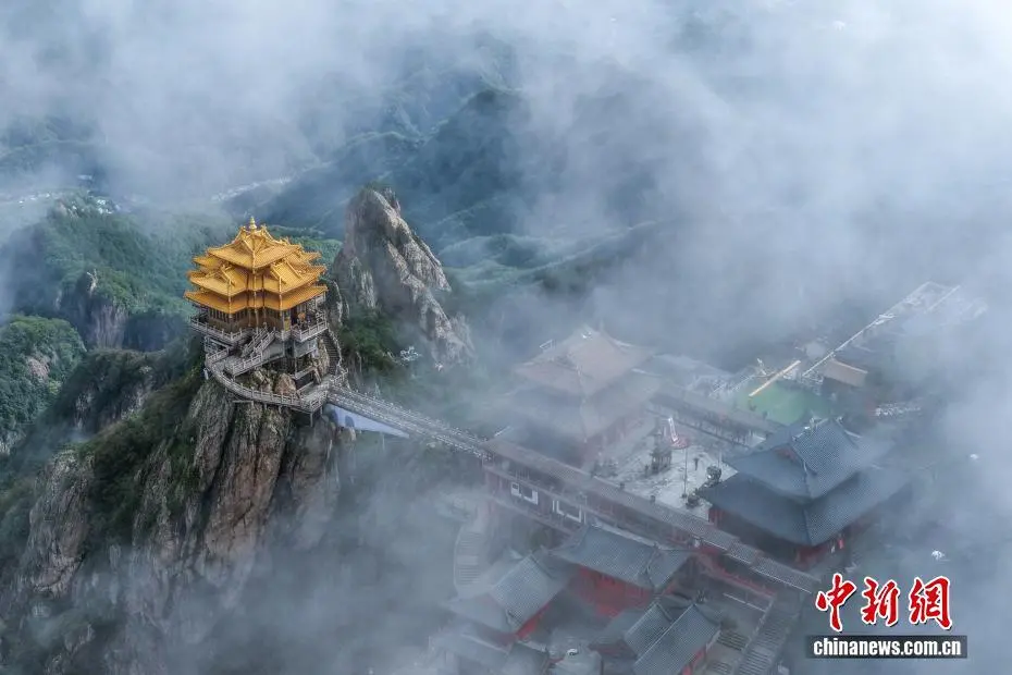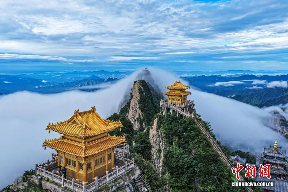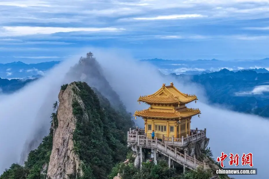 近日,一场秋雨后,河南老君山出现壮美云海景观。山间栈道蜿蜒入云,山巅的金顶建筑在云海中若隐若现,尽显大自然与人文建筑交融之美。段万卿 摄