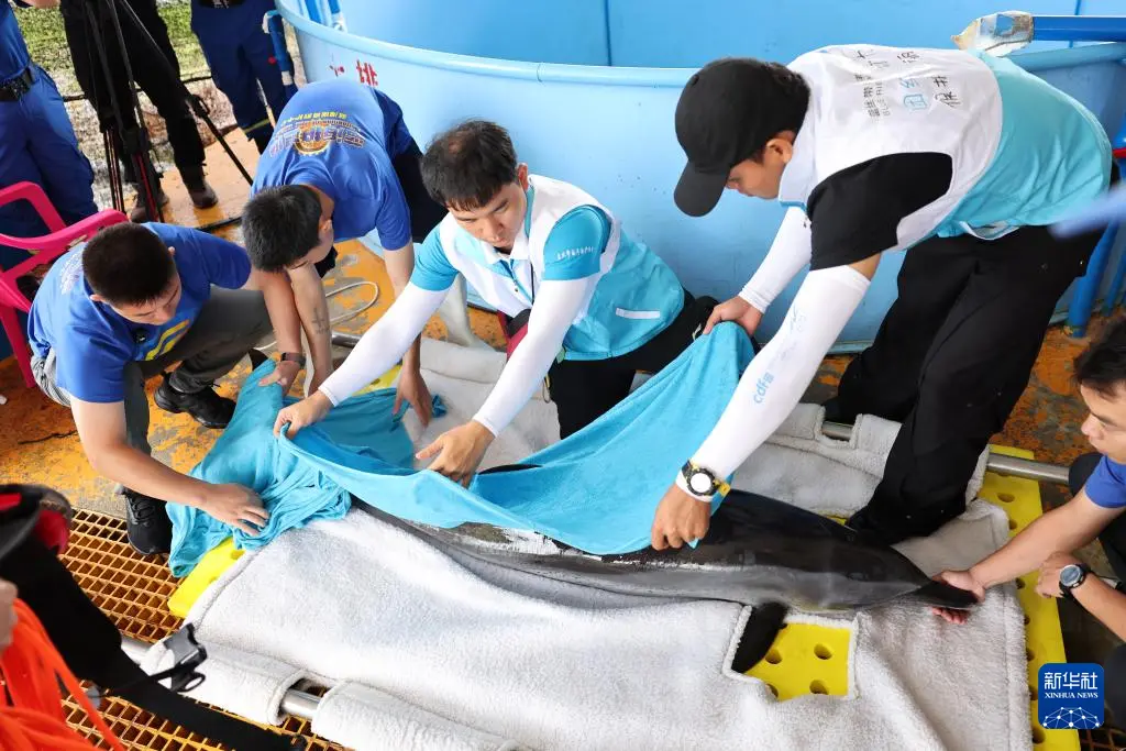 9月14日,在位于海南陵水的救助中心,救助人员将湿毛巾盖在海豚“万万”身上保湿。