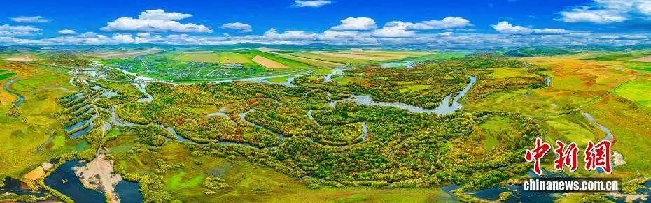 近日,内蒙古自治区呼伦贝尔额尔古纳市秋意正浓。湿地褪去青绿,漫滩草甸染成金黄,蜿蜒水流倒映着蓝天与岸边的彩林,宛如大地铺开的斑斓锦缎;不远处的白桦林更成了“天然画布”,金黄叶片在阳光下闪烁,风过时满林“碎金”摇曳,每一处景致都成了摄影爱好者眼中不容错过的秋日美景。图为额尔古纳的秋景宛如一幅油画。武飞虎 摄