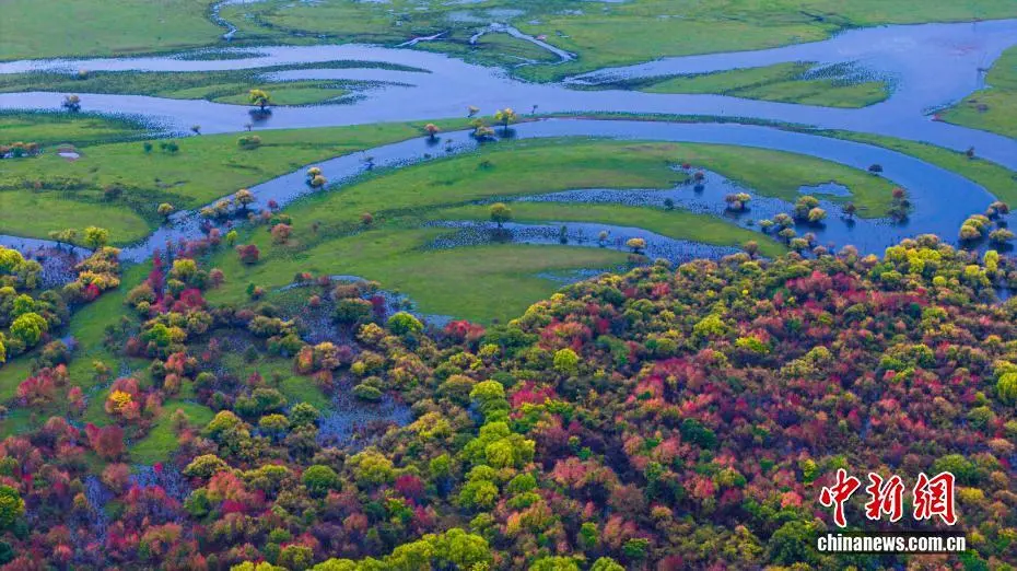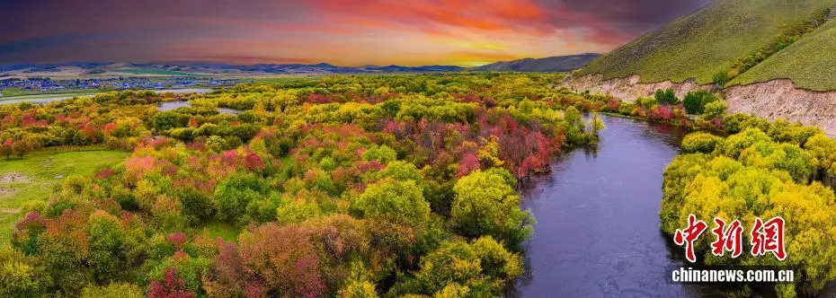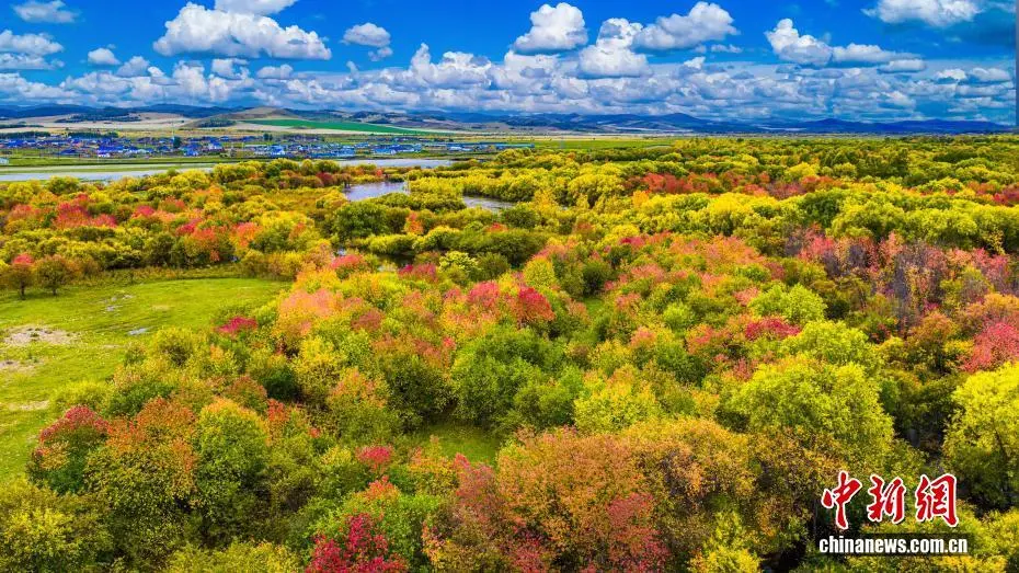 近日,内蒙古自治区呼伦贝尔额尔古纳市秋意正浓。湿地褪去青绿,漫滩草甸染成金黄,蜿蜒水流倒映着蓝天与岸边的彩林,宛如大地铺开的斑斓锦缎;不远处的白桦林更成了“天然画布”,金黄叶片在阳光下闪烁,风过时满林“碎金”摇曳,每一处景致都成了摄影爱好者眼中不容错过的秋日美景。图为清澈的河流与金黄、深红、翠绿的树叶交织,构成了一幅童话般的秋日美景。武飞虎 摄