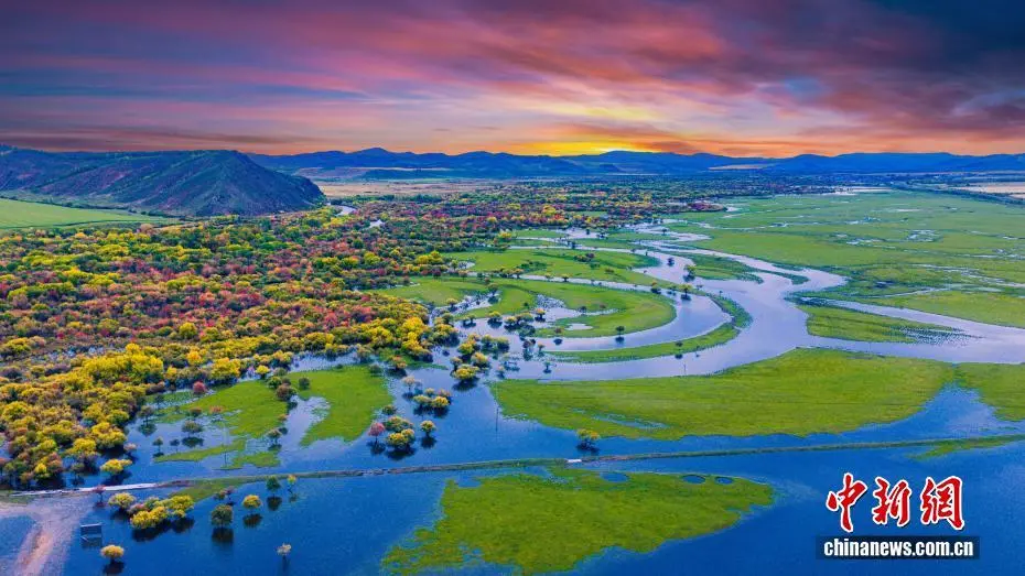 近日,内蒙古自治区呼伦贝尔额尔古纳市秋意正浓。湿地褪去青绿,漫滩草甸染成金黄,蜿蜒水流倒映着蓝天与岸边的彩林,宛如大地铺开的斑斓锦缎;不远处的白桦林更成了“天然画布”,金黄叶片在阳光下闪烁,风过时满林“碎金”摇曳,每一处景致都成了摄影爱好者眼中不容错过的秋日美景。图为黄昏中的湿地如诗如画。武飞虎 摄